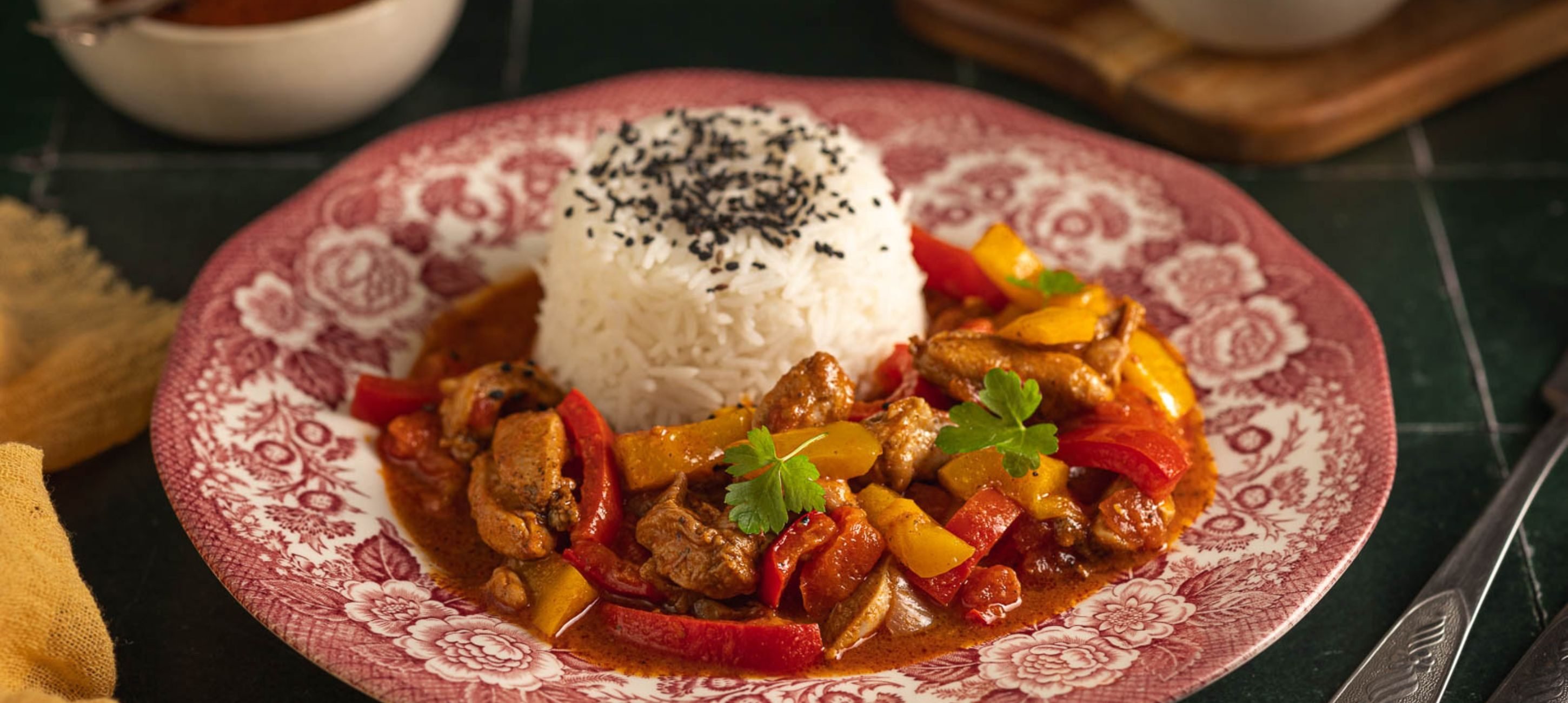 - 2Cibuli očistíme a nakrájíme nadrobno. Papriky omyjeme, rozpůlíme, odstraníme semínka a nakrájíme na proužky. Kuřecí maso nakrájíme na menší kousky, osolíme a posypeme připravenou směsí koření.
