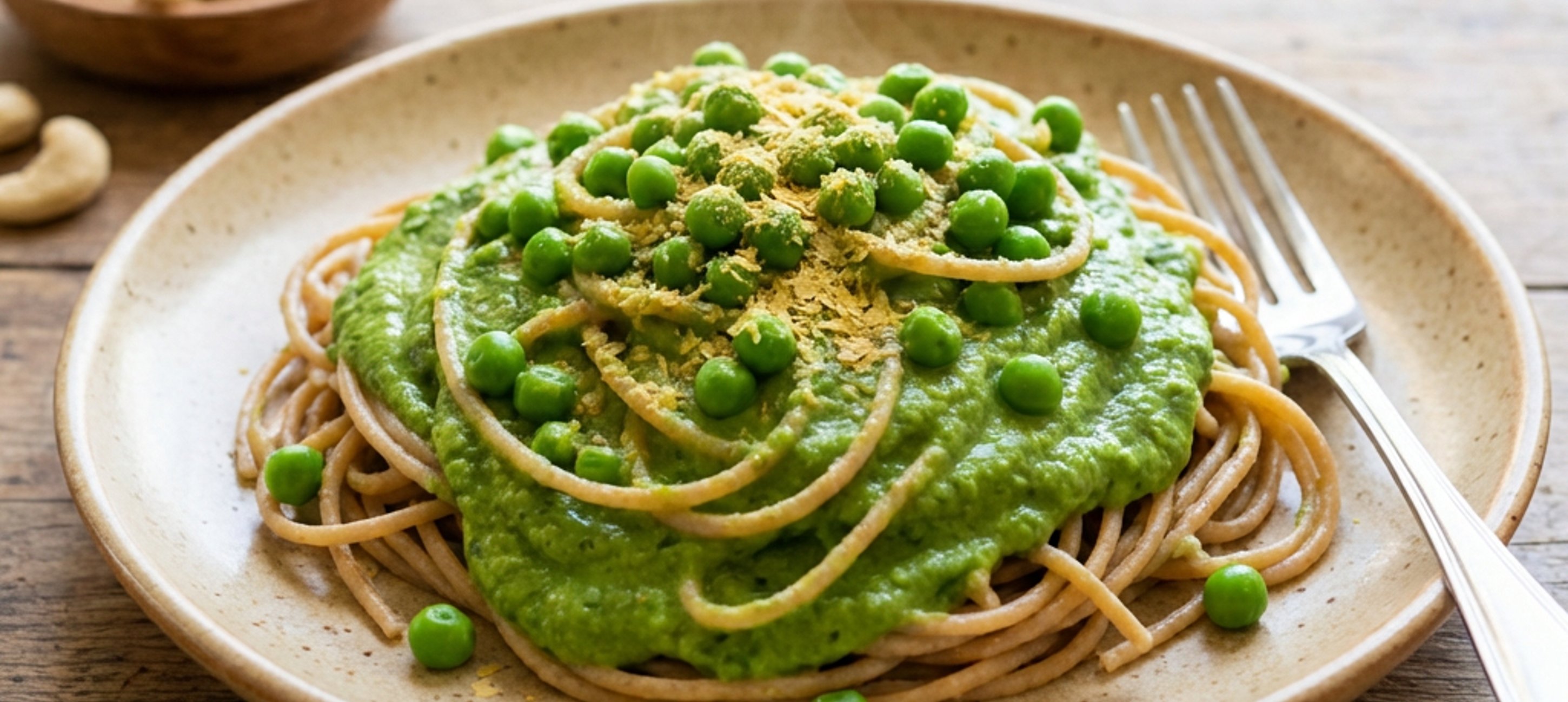 - 3Až se dovaří těstoviny, sceďte je a vraťte zpět do hrnce. Poté k nim přidejte zbytek hrášku a rozmixovanou směs, promíchejte, obsah hrnce rozdělte na 4 porce a podávejte.