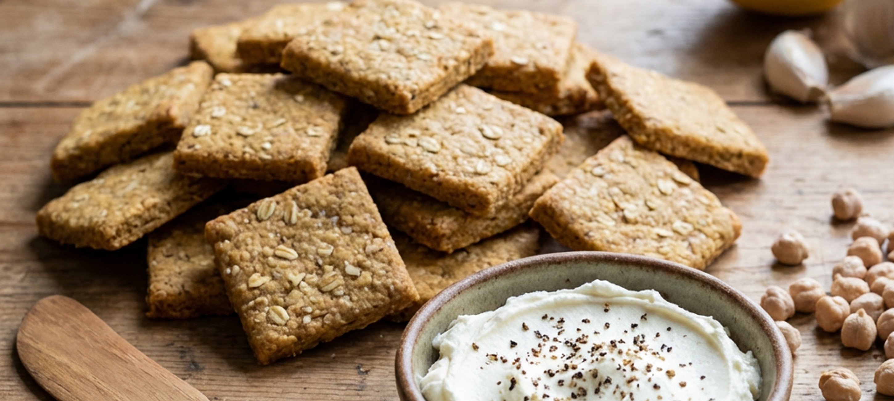 - 3Cizrnu z plechovky sceďte a česnek oloupejte. Scezenou cizrnu i oloupaný česnek přemístěte do mixéru a rozmixujte je téměř najemno. Následně do mixéru přidejte ovesné vločky, řepkový olej, citronovou šťávu a sůl a mixujte 1–2 minuty, dokud se všechny ingredience nespojí. Vzniklou směs přendejte na připravený plech s pečicím papírem, přikryjte ji dalším archem pečicího papíru a přes papír ji válečkem vyválejte na cca 3 mm silný plát. Poté odstraňte vrchní arch papíru, plát těsta nožem rozřežte na kostičky nebo libovolné jiné tvary a pečte 30–35 minut při 170–180 °C.