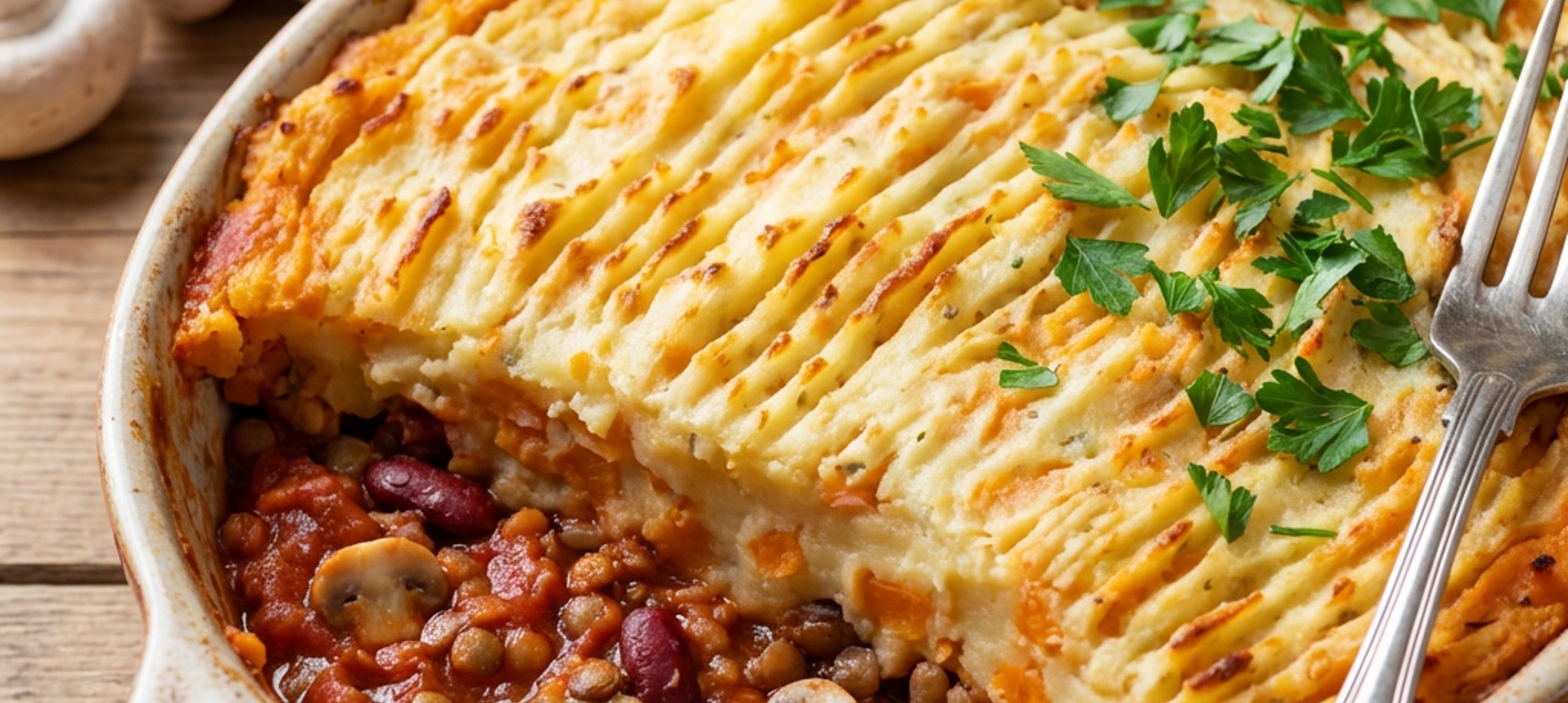 - 6Hotovou fazolovou směs v pánvi smíchejte s nakrájenou petrželovou natí a dochuťte citronovou šťávou, solí a pepřem. Následně obsah pánve přendejte do připravené zapékací formy a naneste na ni kaši z brambor a batátu. Navrchu kaše vytvořte pomocí vidličky pruhy, formu dejte do trouby a koláč pečte 35–40 minut při 200–210 °C dozlatova.