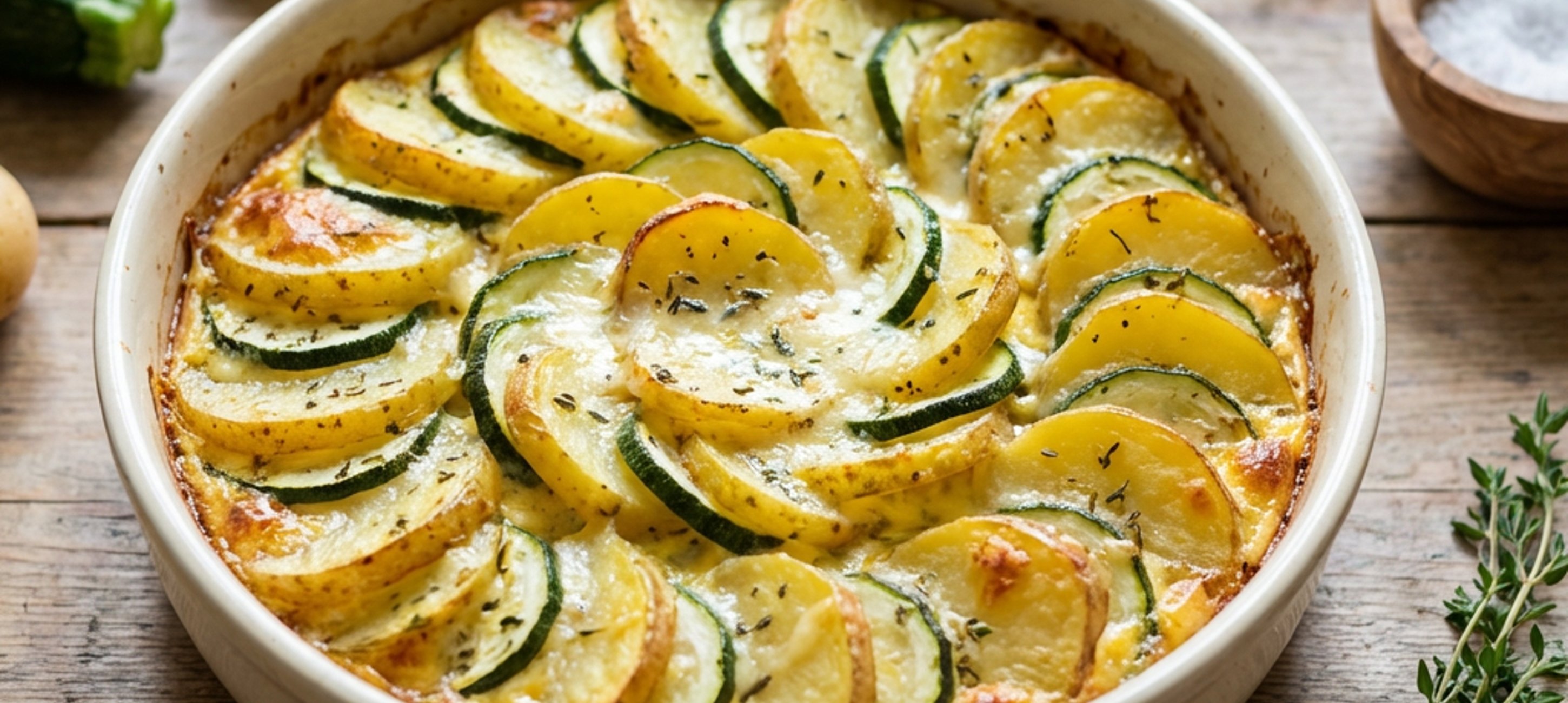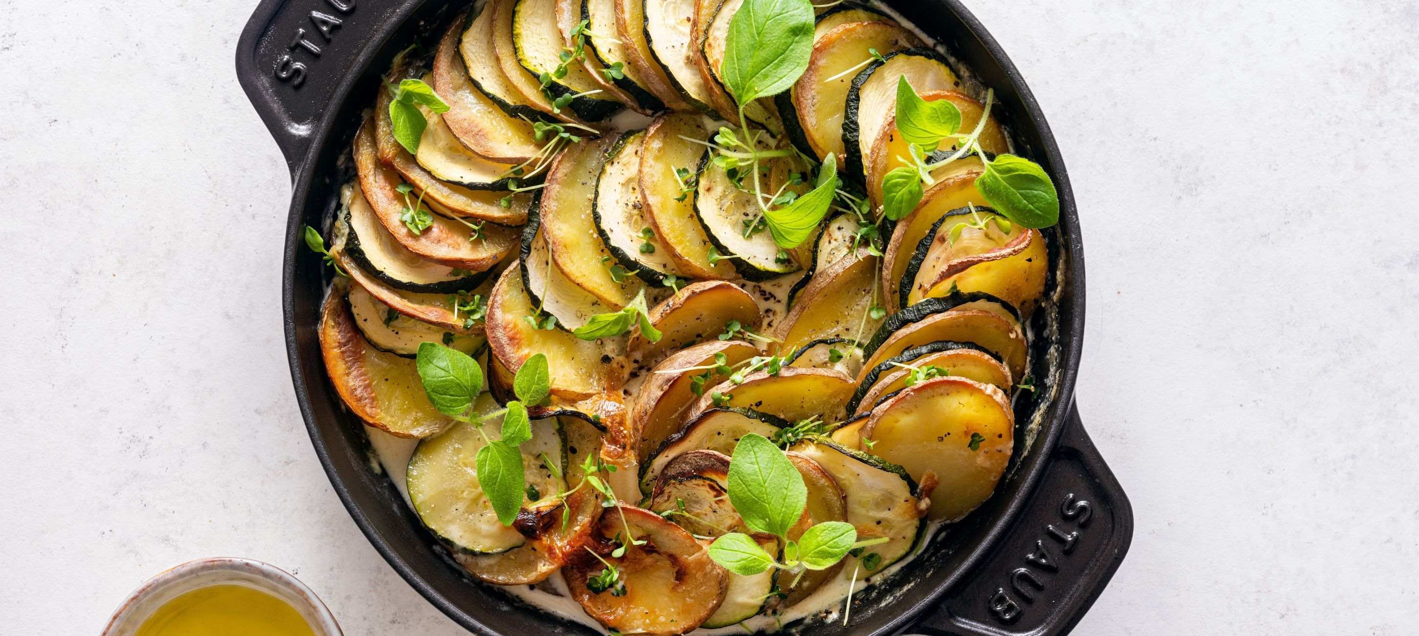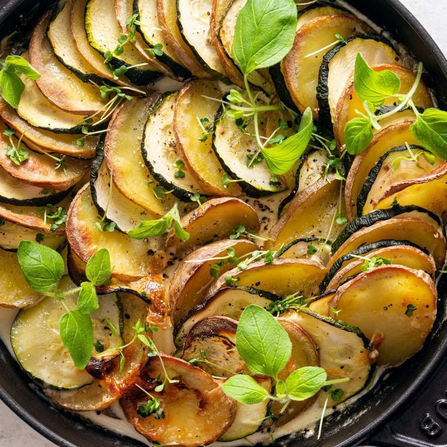 - 6Hotové zapečené brambory s cuketou rozdělte na 4 porce a podávejte.