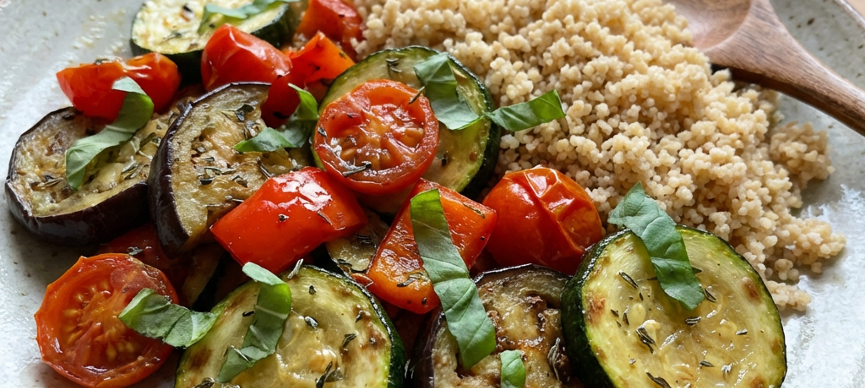 - 5Po 3–4minutovém opékání směsi v pánvi vypněte ohřev, přidejte do pánve natrhanou bazalku, promíchejte a podávejte s kuskusem.