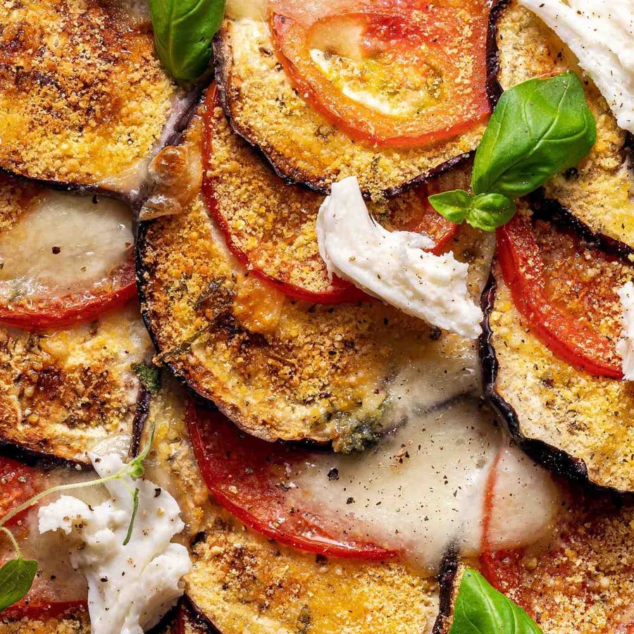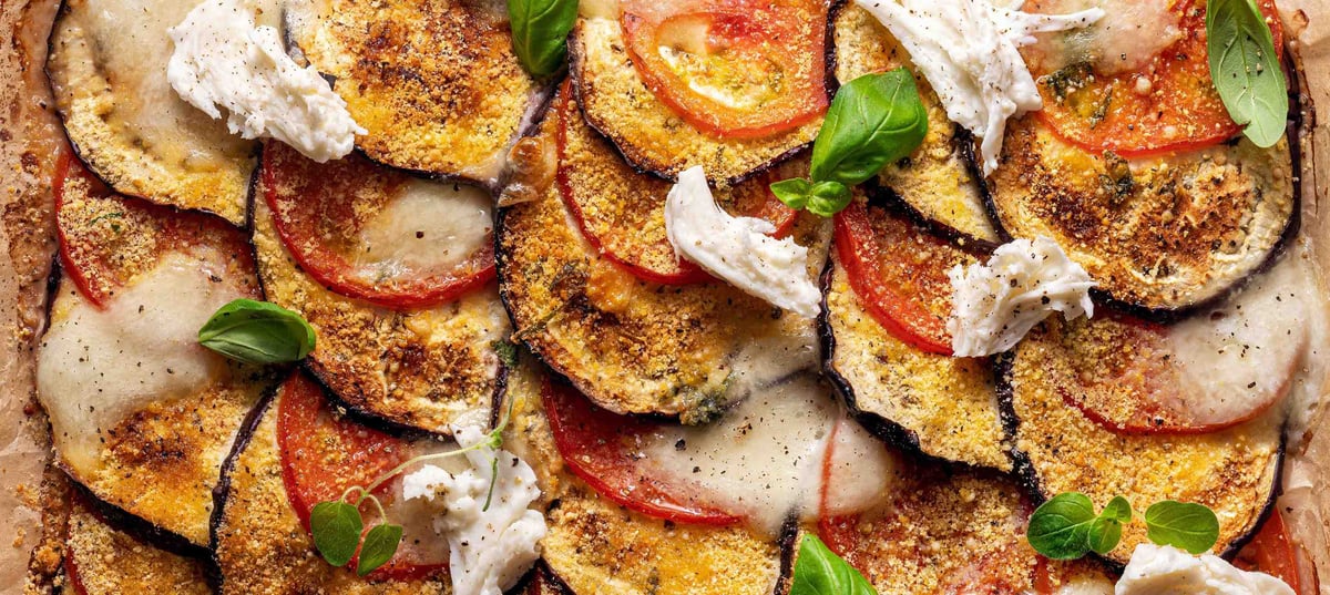 - 2Lilek a rajčata omyjte a nakrájejte na plátky o šířce zhruba 0,5 cm, které naskládejte na vyložený plech do několika řad takovým způsobem, aby se v jednotlivých řadách střídaly plátky lilku a plátky rajčete. Plech vložte do trouby a zeleninu pečte 12–13 minut při 190–195 °C.
