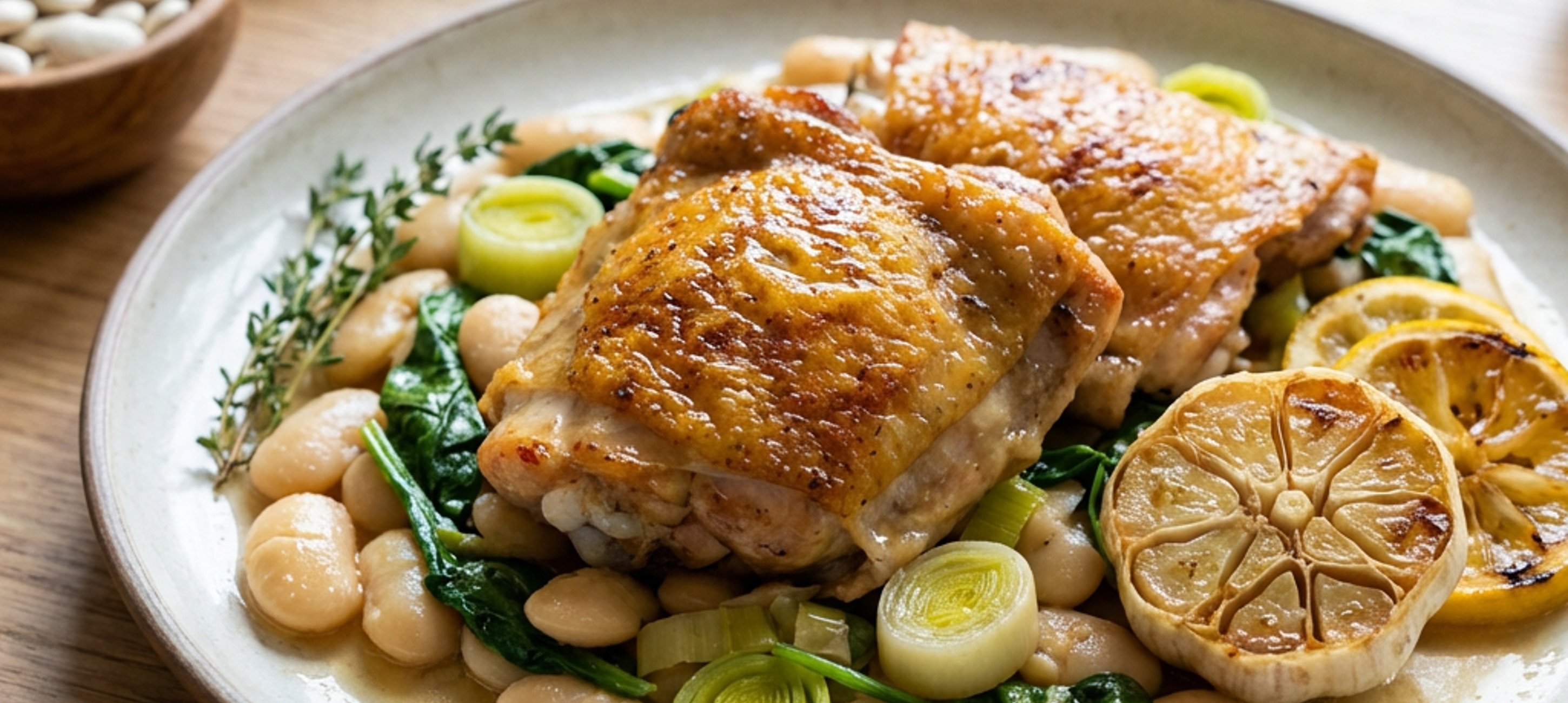 - 2Pórek nakrájejte na válečky o délce 2 cm. Palici česneku rozkrojte na půl. Citron nakrájejte na plátky. Všechny tři suroviny přemístěte do připraveného pekáče, přidejte máslové fazole z plechovky, 100 ml vody, 2 lžíce oleje, sušený tymián, sůl a pepř a vše promíchejte. Poté si v malém rendlíku na mírném plameni rozpusťte máslo (potrvá to 1–2 minuty). Rozpuštěným máslem a vinným octem následně potřete kuřecí stehna, osolte je, opepřete a položte na suroviny v pekáči. Pekáč dejte do předehřáté trouby a pečte 45–50 minut při 185–190 °C.