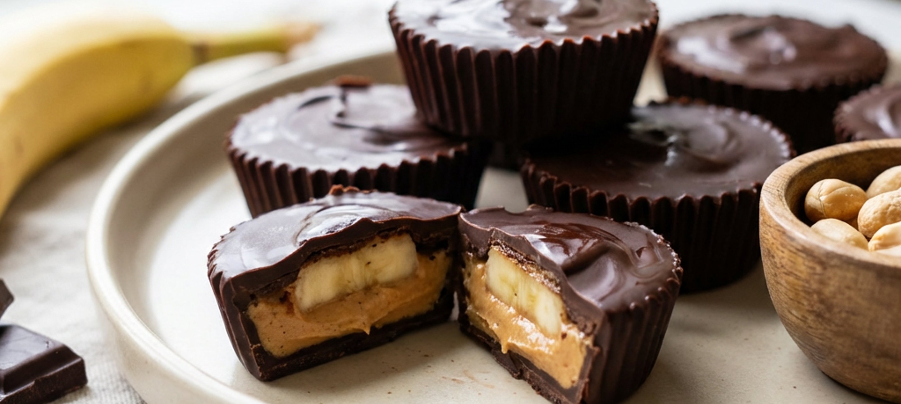 - 1Připravte si silikonovou formu na 12 muffinů a nad vodní lázní* si rozpusťte čokoládu se 2 lžičkami kokosového oleje; v mezičase nakrájejte banán na 12 koleček. Poté do prohlubní ve formě rozdělte 180 g rozpuštěné čokolády, kolečka banánu a arašídové máslo a formu dejte na 5–10 minut do mrazáku. Následně do prohlubní rozdělte zbytek rozpuštěné čokolády, dejte mrazit na dalších 10–15 minut a podávejte.