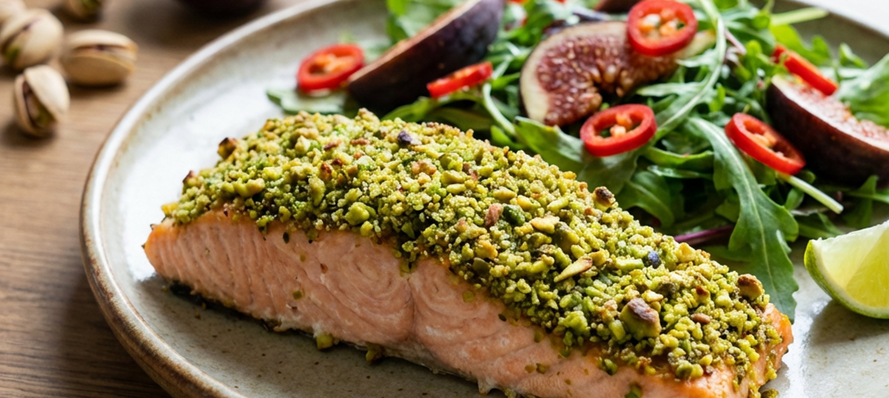 - 2Na talíř si připravíme salát, nakrájené fíky, posypeme zbytkem pistácií a sekanou chilli papričkou. Zakápneme olivovým olejem a osolíme. Podáváme s lososem. Ideálně po prolomení krusty ještě lososa na talíři dosolíme, opepříme a zakápneme limetovou šťávou.