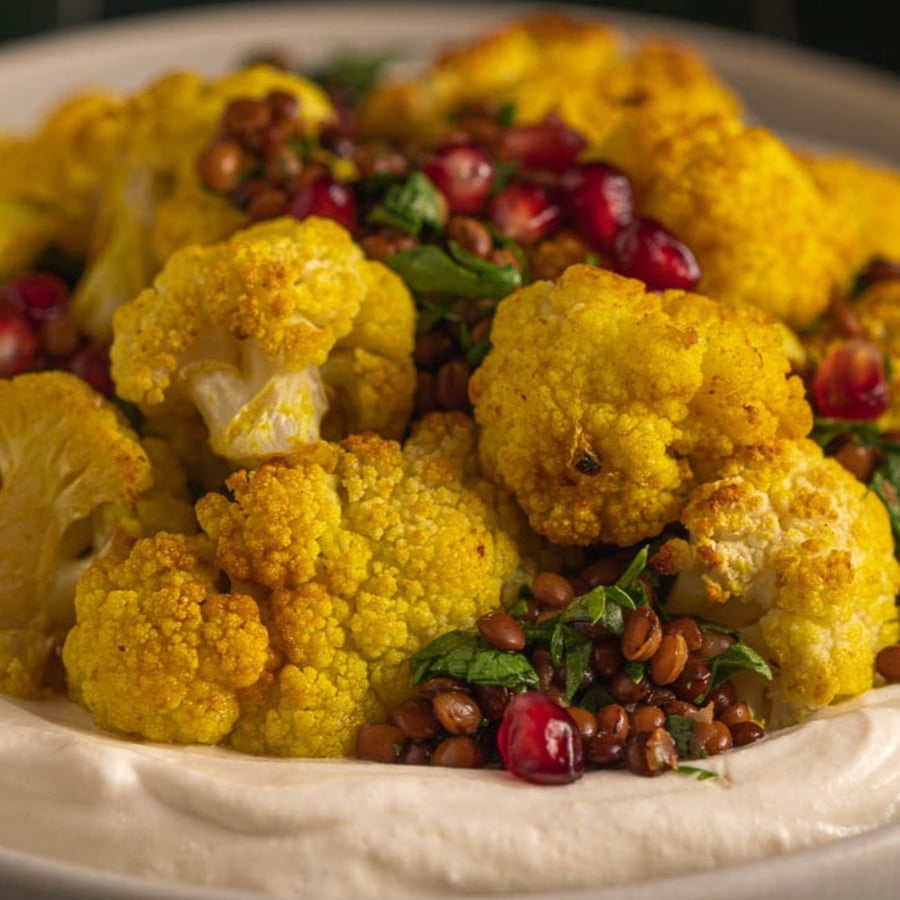 - 5Spread the yogurt with tahini on the bottom of a plate and top with roasted cauliflower and lentil salad. Sprinkle with pomegranate seeds. Serve with pita bread.