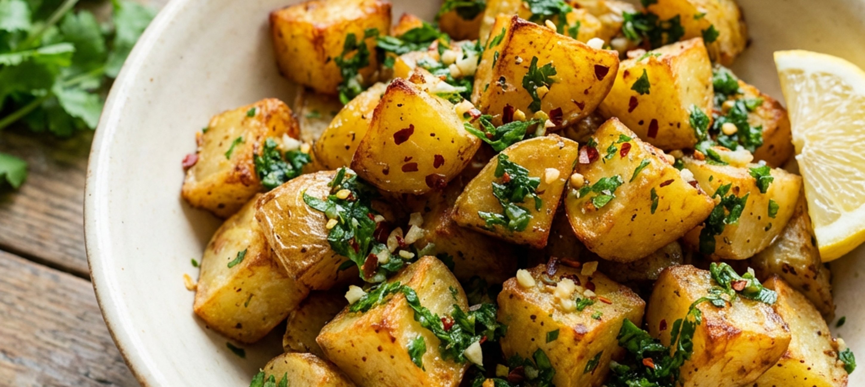 - 2Zatímco se brambory pečou, nakrájejte si najemno petrželovou nať a koriandr a obojí vložte do větší mísy. Česnek oloupejte a prolisujte. Poté si vezměte menší pánev a na středním plameni v ní rozehřejte 1 lžíci oleje. Až se olej rozehřeje, dejte do pánve chilli vločky, prolisovaný česnek a ½ celkového množství nakrájené petrželové natě i koriandru a vše opékejte 60–90 sekund na středním plameni, dokud se směs nerozvoní. Následně ji z pánve přendejte do mísy ke zbytku petrželové natě a koriandru.