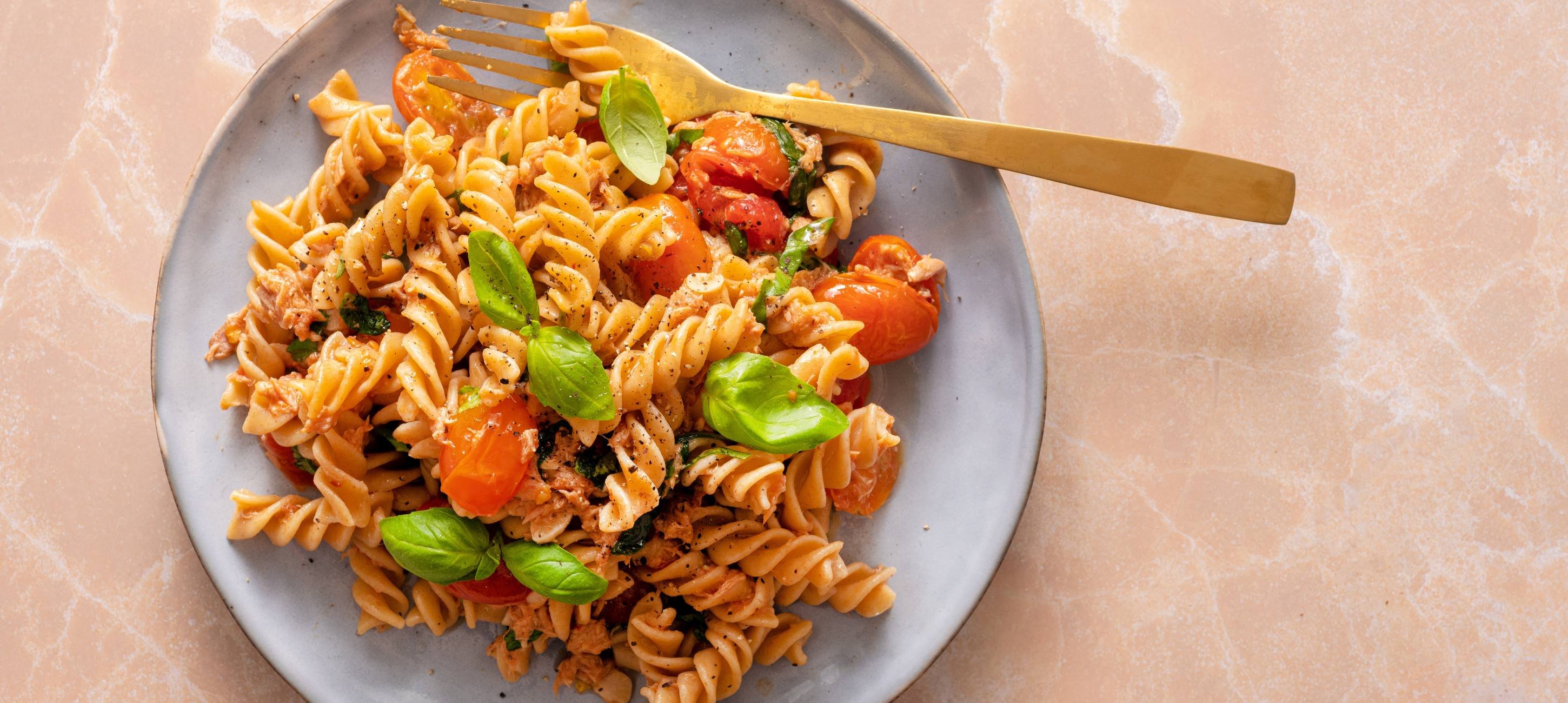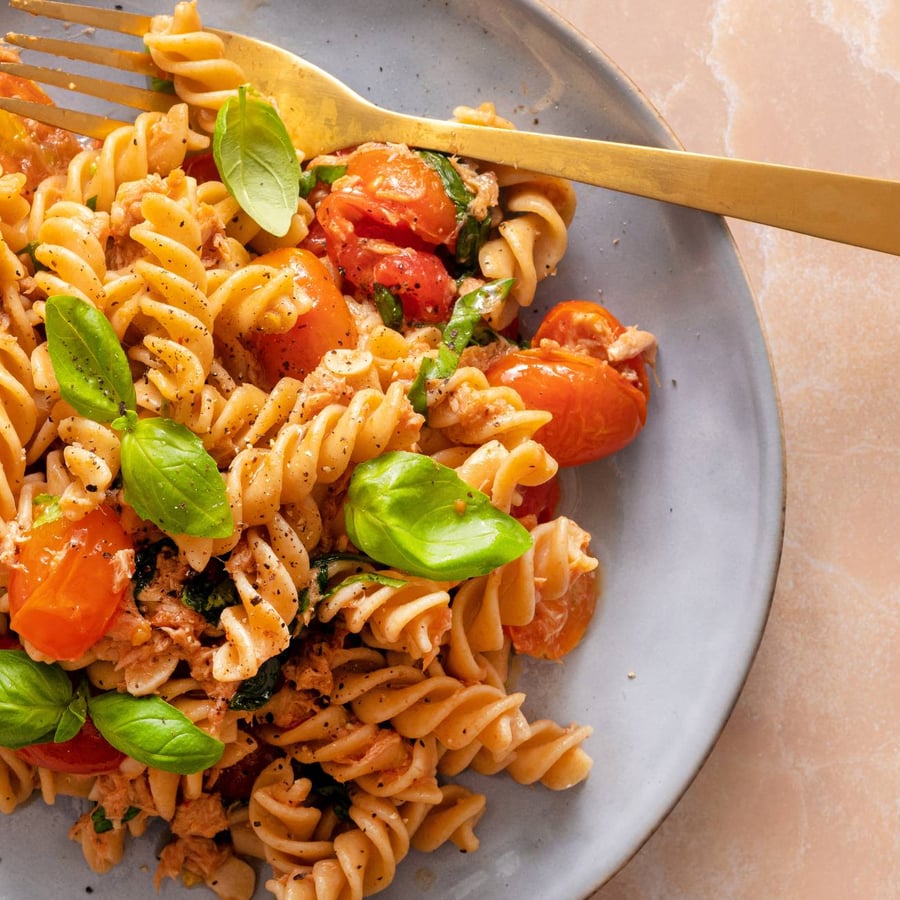 - 3By this time, the pasta should be finishing cooking. Once cooked, take 100 ml of the pasta water from the pot and drain the rest. Once the cherry tomatoes in the pan release their juice, pour 100 ml of pasta water into the pan, add the drained tuna, and while stirring constantly, heat the entire mixture for another 1–2 minutes over low to medium heat until it thickens.