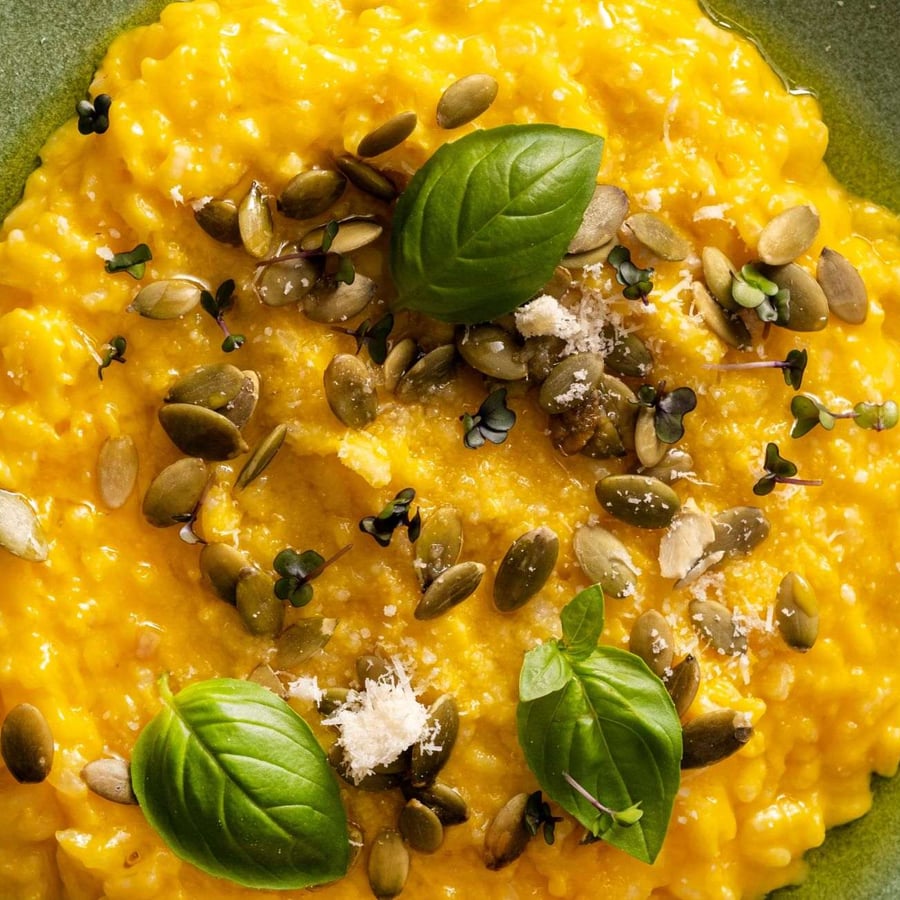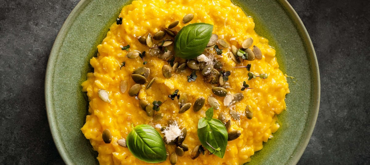 - 2Now take a larger pan and heat 2 tablespoons of oil over medium heat. Then add the chopped onion to the pan and sauté for 2–3 minutes over medium heat. Next, add the chopped garlic and sauté for another 30–60 seconds. Then sprinkle the rice into the pan and sauté everything for another 2–3 minutes until the rice turns white. Subsequently, process the vegetable broth in a total of 5 batches: Always pour 200 ml of broth into the pan, cook for 4–5 minutes over medium heat until almost all the broth is evaporated, and only then add the next batch. Mix the last, fifth batch of broth with the pumpkin purée, pour it into the pan, and heat for only 3–4 minutes this time, until the final batch of broth is absorbed and the whole mixture thickens.