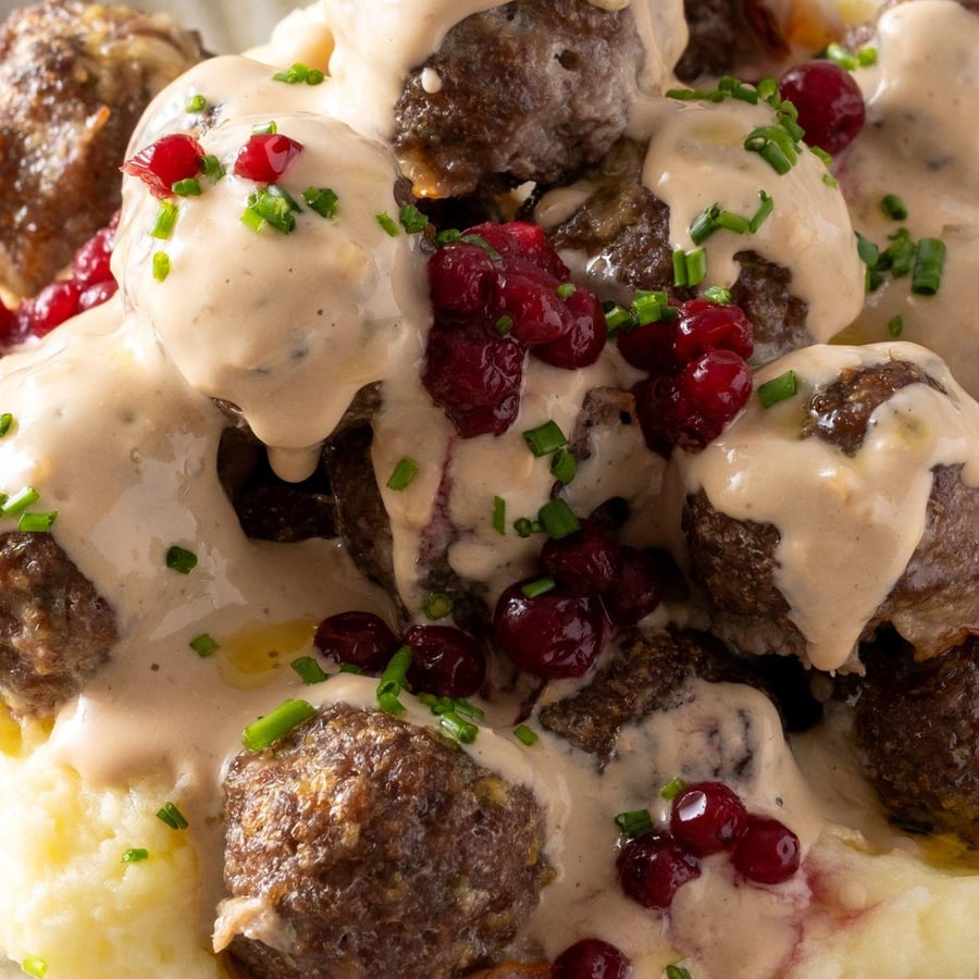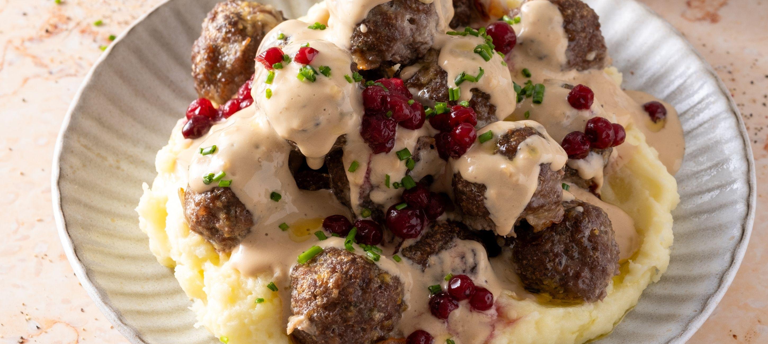 - 6Divide the meatballs, mashed potatoes, and finished sauce into 4 servings, sprinkle each with dried cranberries, and serve.