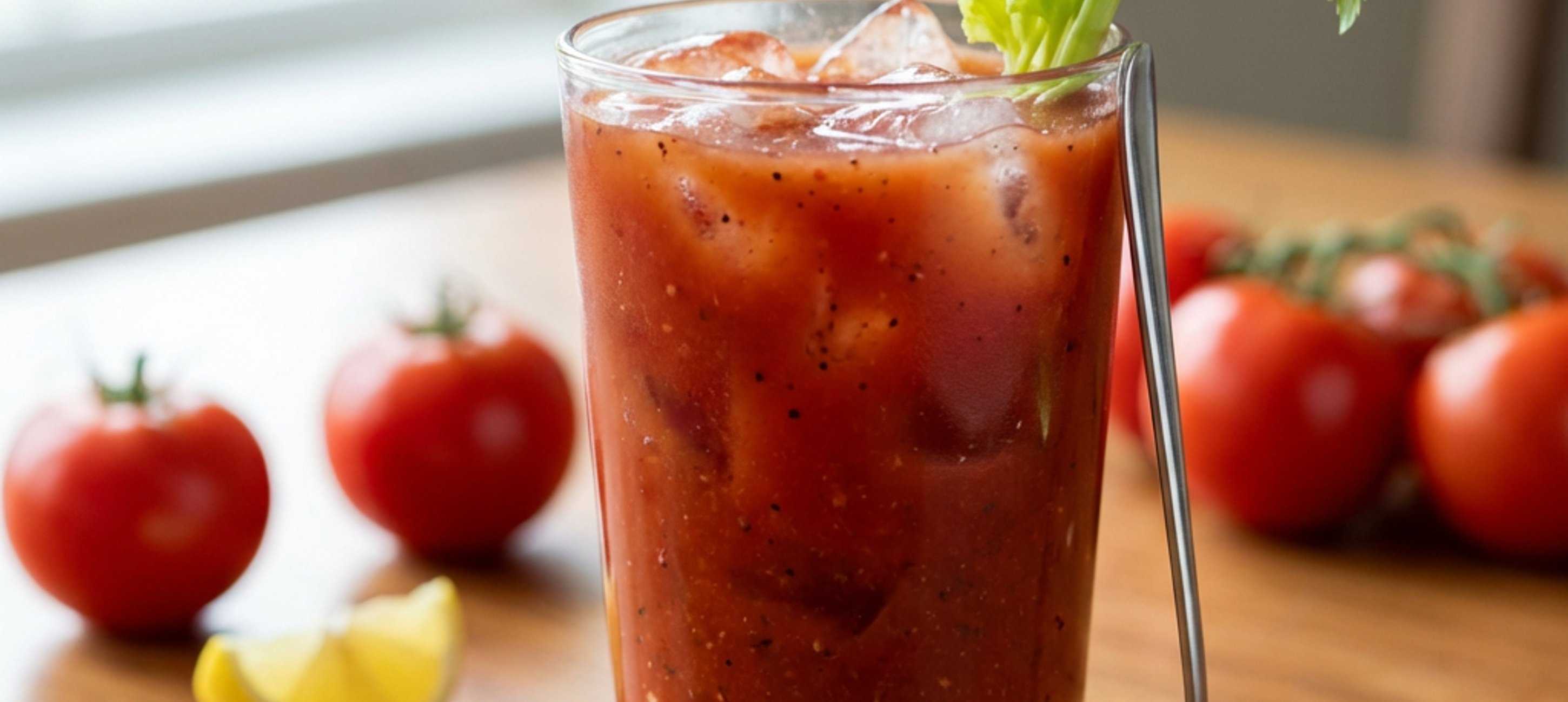 - 2V šejkru nebo větší sklenici smíchejte čerstvou rajčatovou šťávu s vodkou.