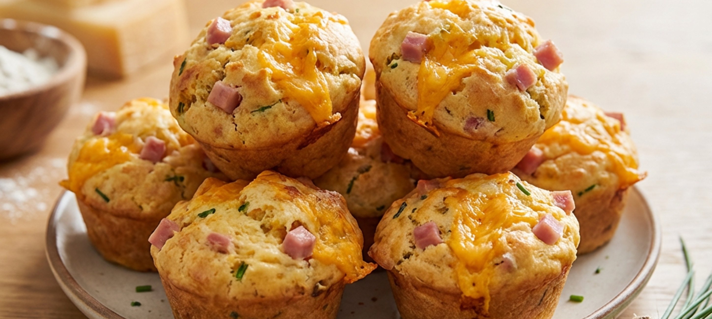 - 2V jedné míse smíchejte mouku, prášek do pečiva, jedlou sodu, sůl a mletý pepř. Do suchých ingrediencí přidejte nastrouhaný sýr a šunku nebo slaninu, pokud je používáte, a promíchejte.