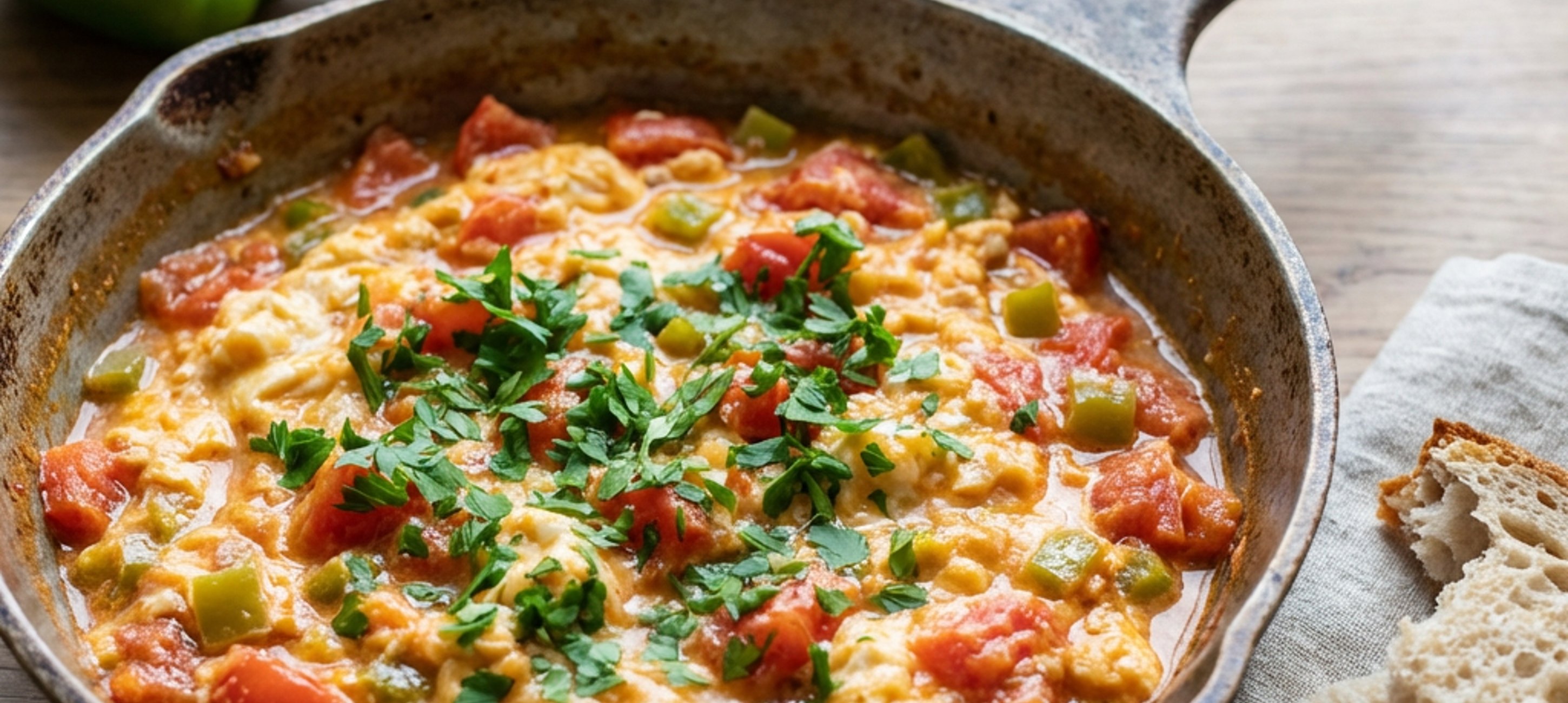 - 2Nyní si v pánvi na středním plameni rozehřejte 2 lžíce olivového oleje, přidejte nakrájenou cibuli a papriku a opékejte 3–4 minuty na středním plameni. Poté přidejte nakrájená rajčata a mletý římský kmín a vše opékejte další 2–3 minuty na středním plameni. Následně do pánve vyklepněte 4 vejce, celou směs osolte a opepřete a za stálého míchání obsah pánve opékejte 1–3 minuty na středním plameni, dokud vajíčka náležitě neztuhnou. Jakmile získají požadovanou konzistenci, vmíchejte do pánve nasekanou petrželovou nať a pánev odstavte z ohřevu.