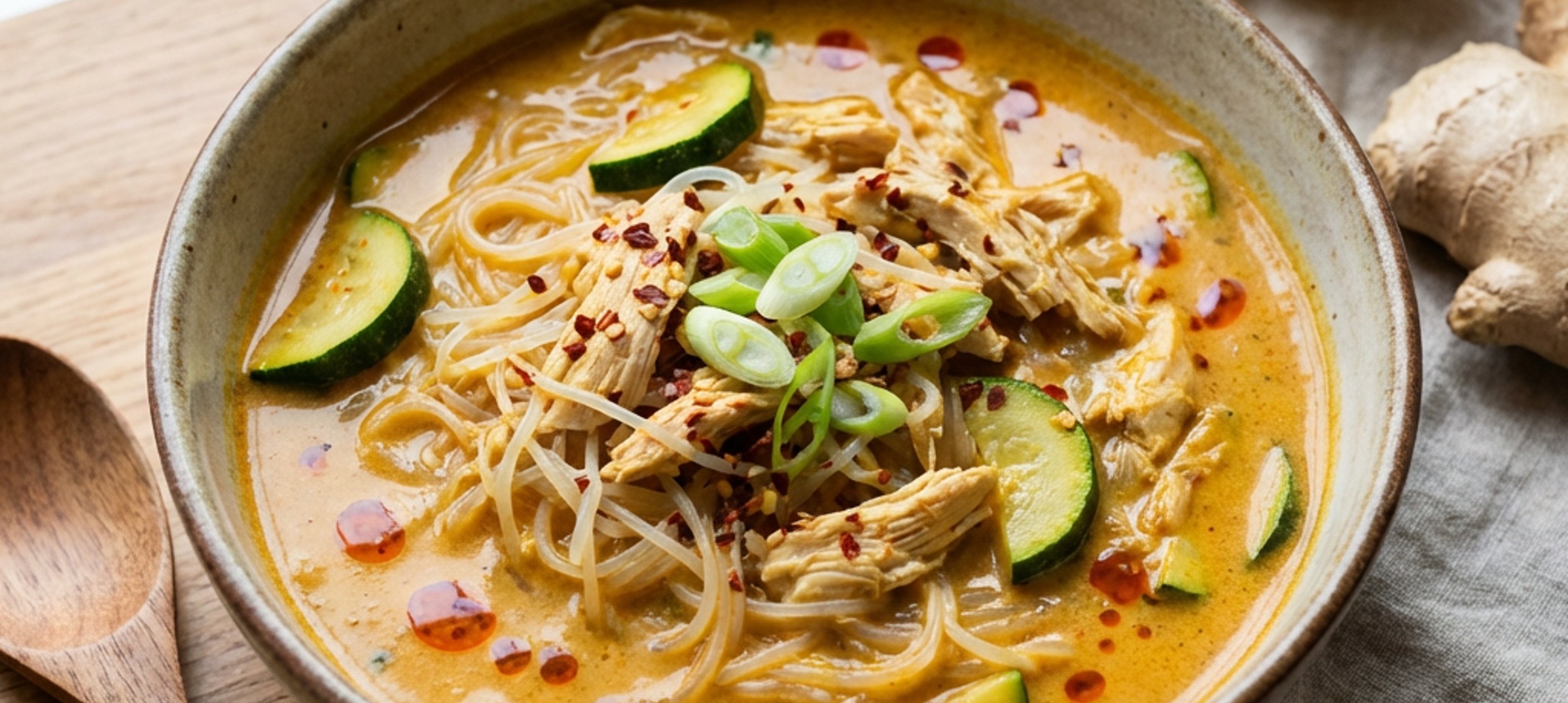 - 1Nejprve si připravte kari pastu: Zázvor a česnek oloupejte, dejte do mixéru, přidejte všechny ostatní ingredience na pastu a rozmixujte dohladka. Následně očistěte kuřecí maso, oloupejte cibuli a nakrájejte ji na tenké plátky.