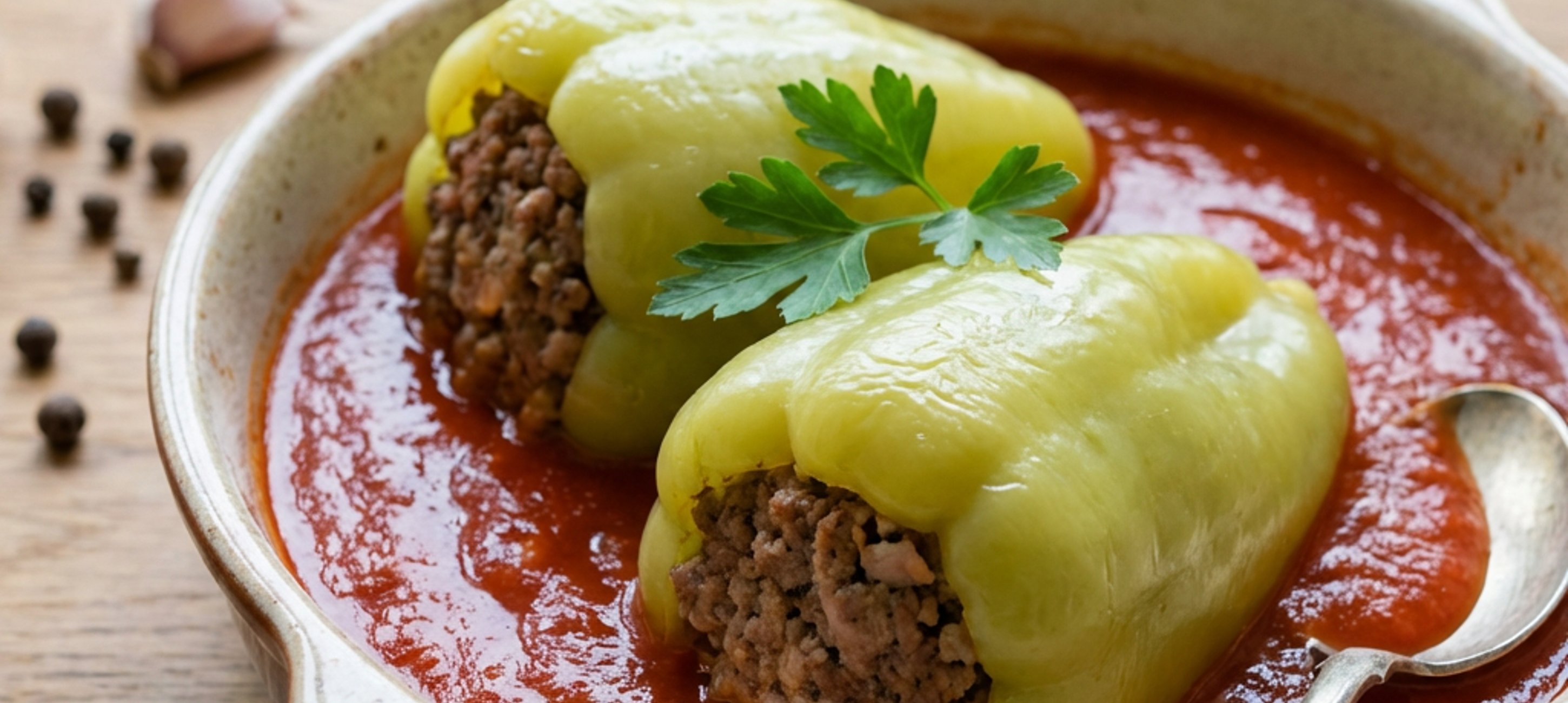 - 5Do pekáče vložíme krájená rajčata, kuřecí vývar, cukr a sůl. Promícháme a přidáme naplněné papriky. Pečeme 45 minut.