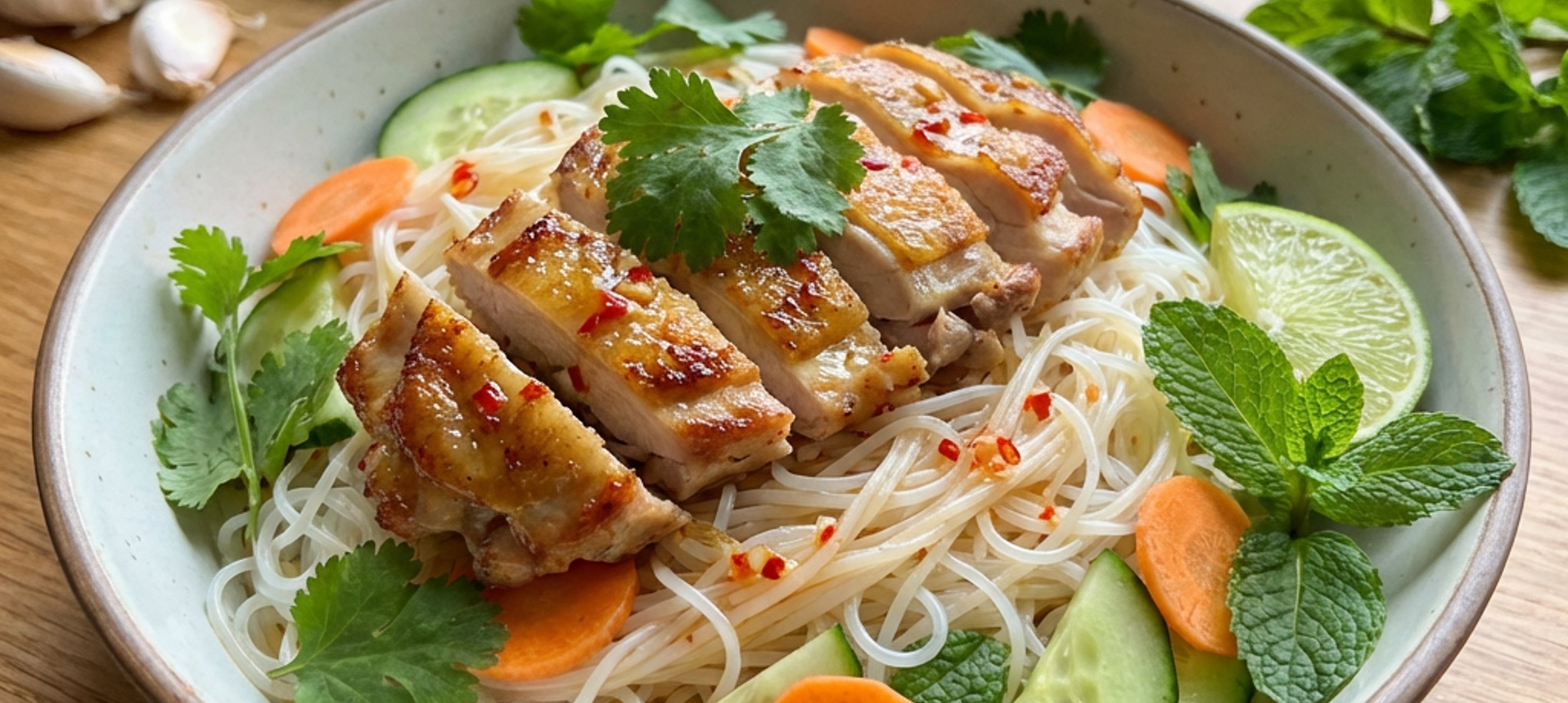 - 6Nyní si připravte 2 misky a rozdělte do nich uvařené rýžové nudle. Navrch každé porce rozprostřete nakrájenou okurku, mrkev, římský salát, koriandr, mátu a nakrájené kuřecí maso. Na závěr každou porci přelijte připravenou zálivkou a podávejte.