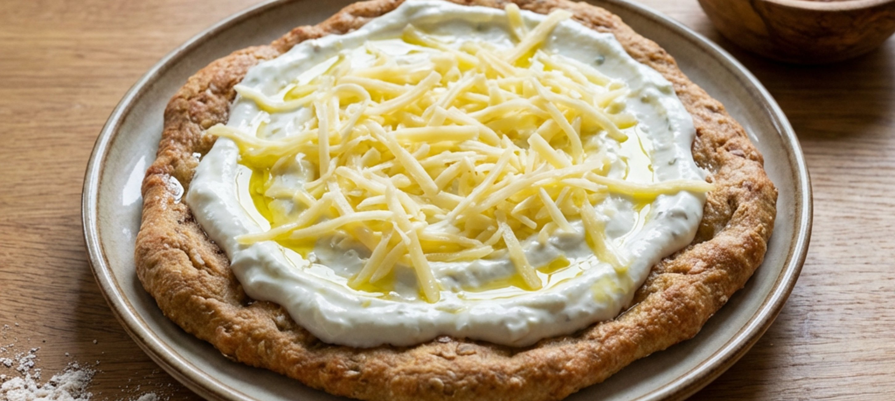 - 6Upečené placky potřete vychlazeným tvarohovým dipem, posypte nastrouhaným eidamem, pokapejte celkem 2 lžícemi olivového oleje a podávejte.