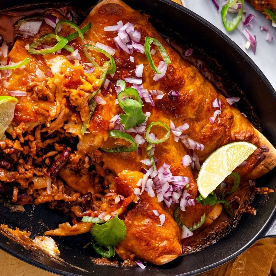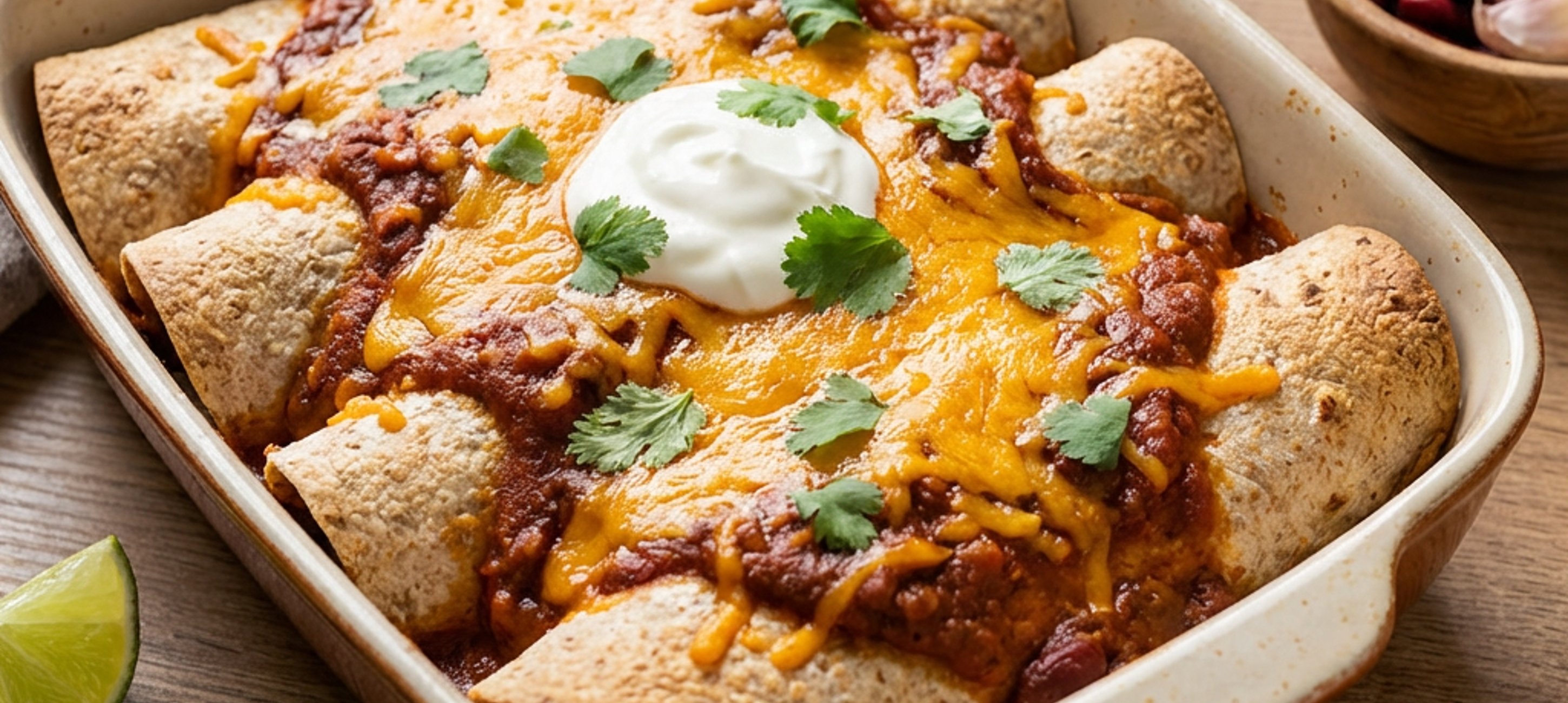 Enchiladas podávejte se zakysanou smetanou, čerstvým koriandrem, najemno nakrájenou červenou cibulí a limetkou nakrájenou na měsíčky.