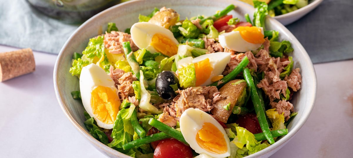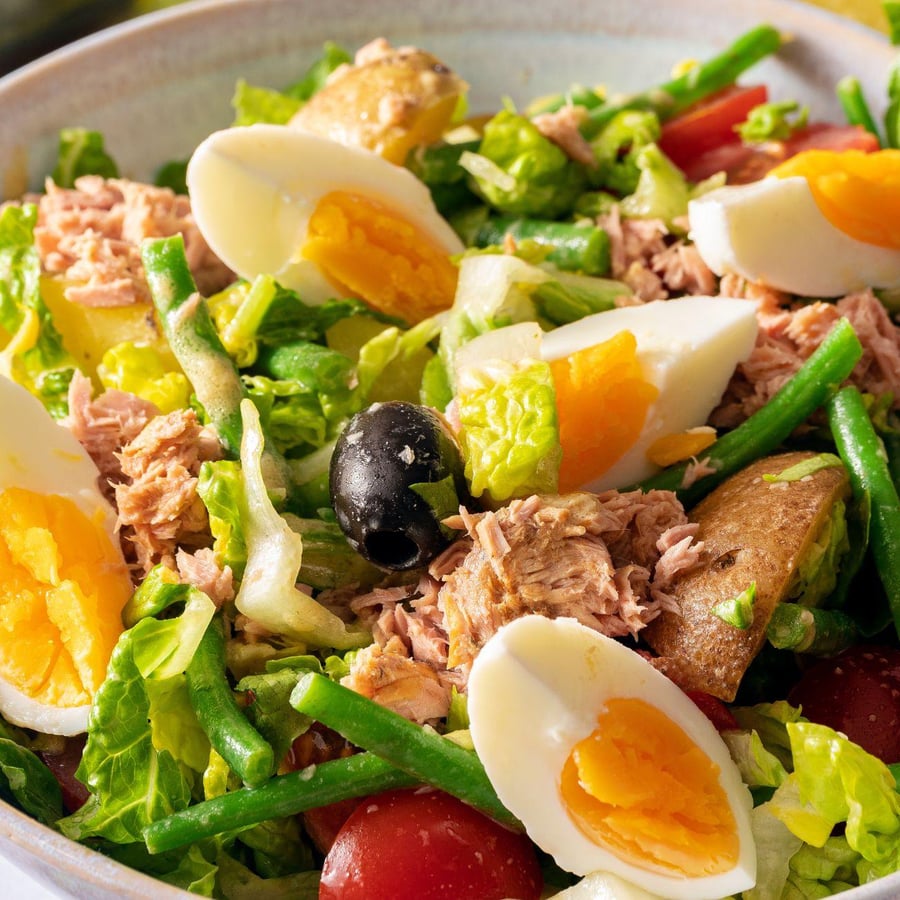 - 5Next, add the chopped potatoes, cooked green beans, and black olives to the bowl with the dressing. Drain the tuna and add it to the bowl as well. Then add the chopped tomatoes and Little Gem lettuce to the bowl and mix the entire contents of the bowl.