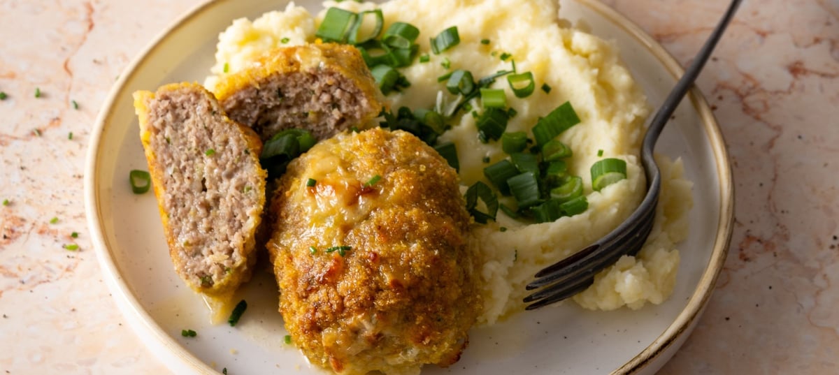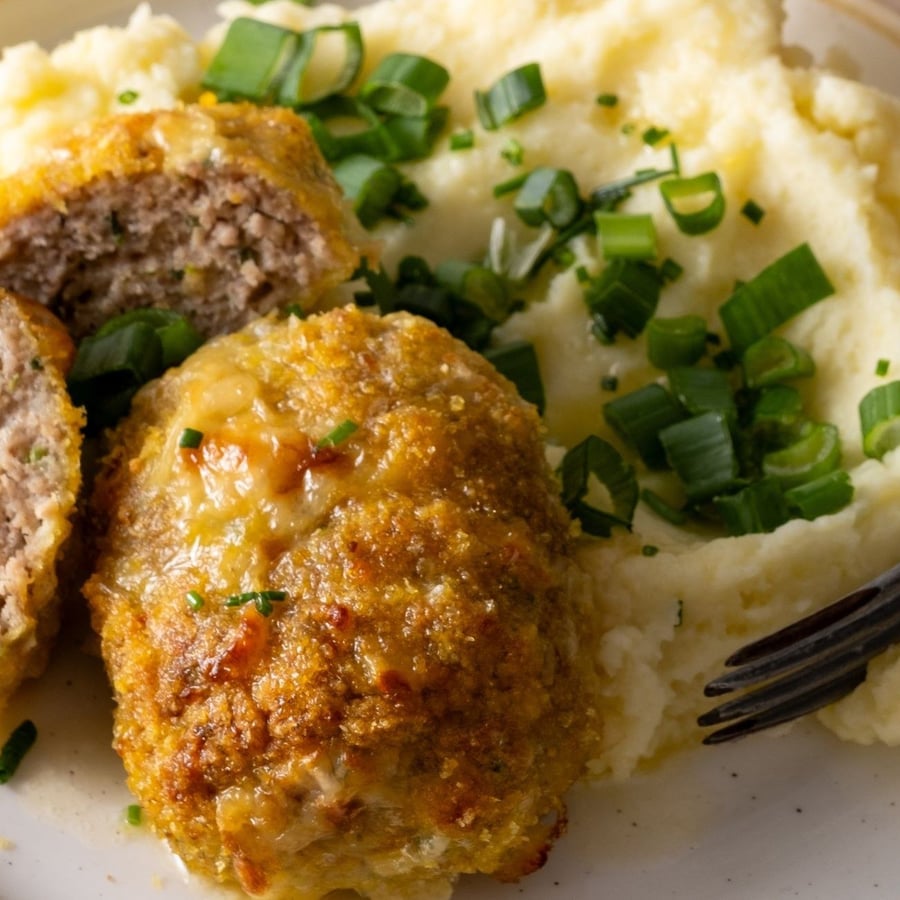 - 6Once the Dutch schnitzels are baked, divide them onto 4 plates and serve with mashed potatoes and chopped spring onions.