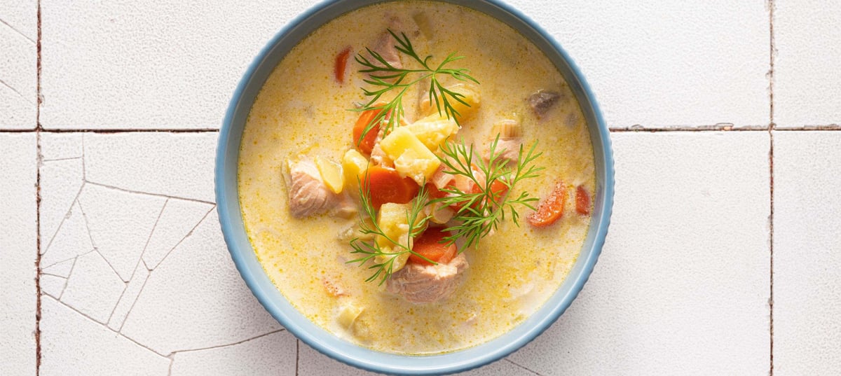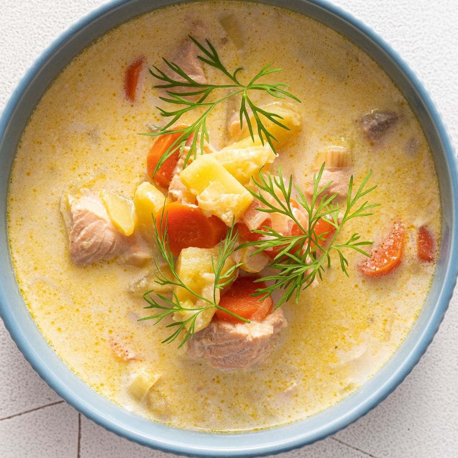 - 2Now take a larger pot and heat 3 tablespoons of olive oil over medium heat. Then add the sliced carrots, potatoes, and leek to the pot and sauté everything for 4–5 minutes over medium heat. Next, add the fish stock, salt, and pepper, and bring the contents of the pot to a boil over high heat. Then reduce the heat to medium and cook the soup for 13–15 minutes until all the vegetables are tender.