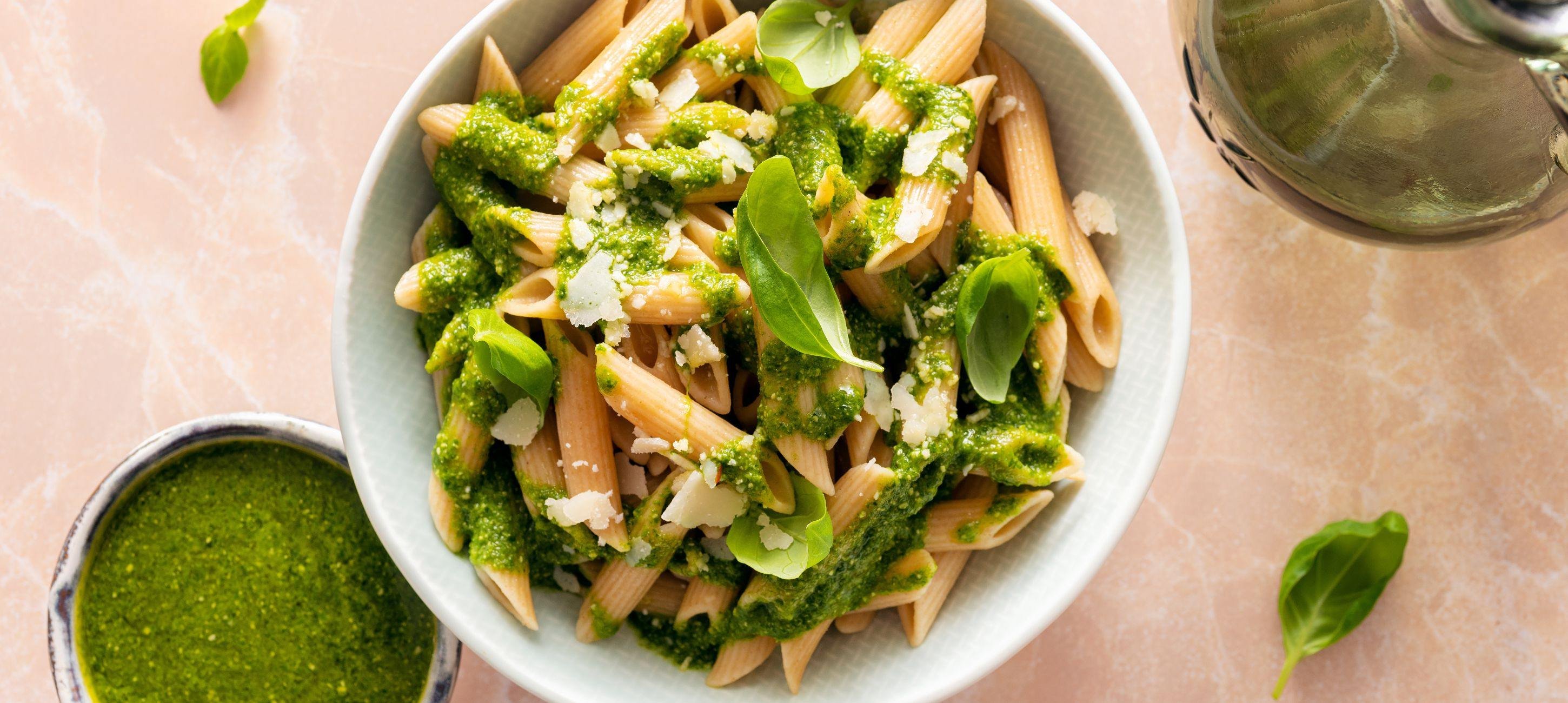 Instead of an immersion blender, use a mortar and pestle to crush all the ingredients. Serve the finished pesto with cooked pasta, Parmesan shavings, and fresh basil.