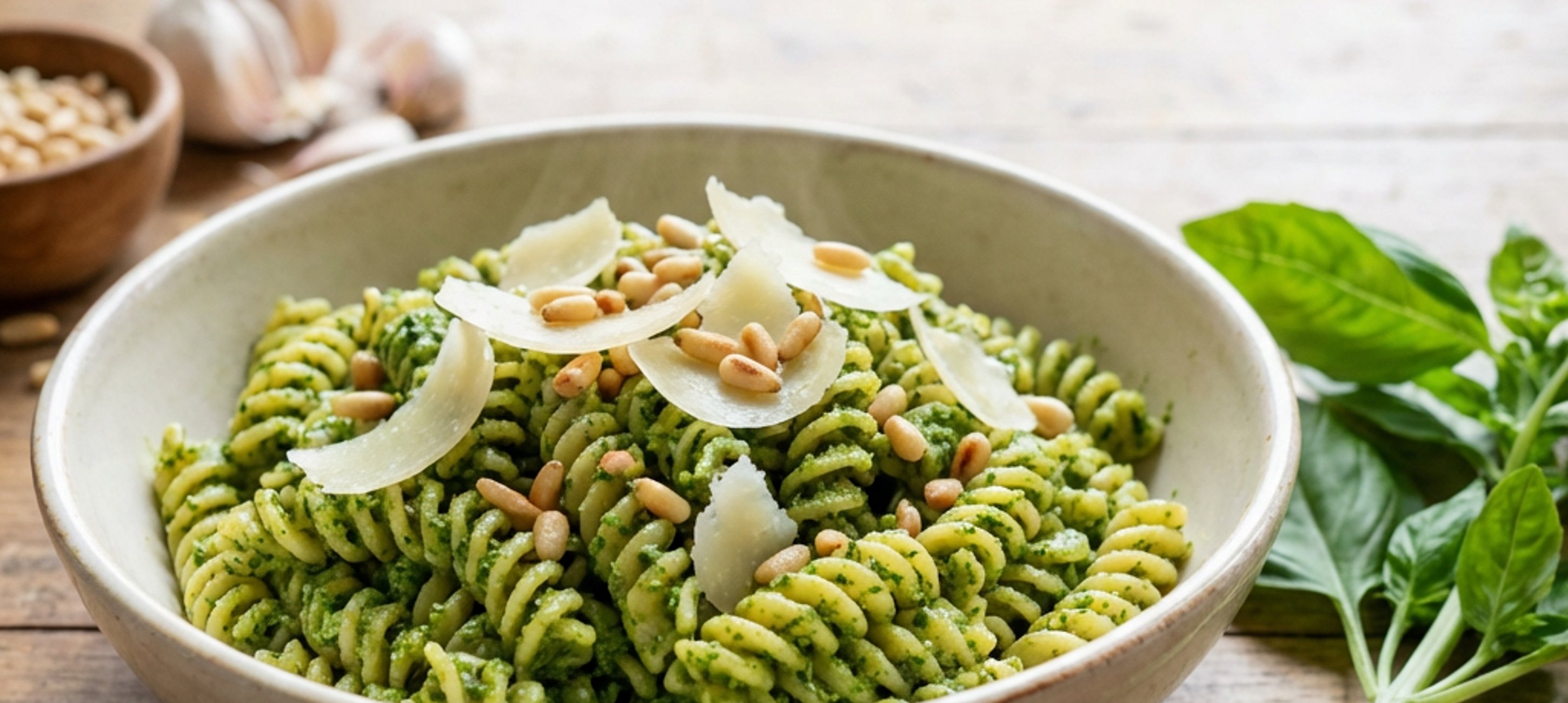 Místo tyčového mixéru použijte hmoždíř, ve kterém všechny suroviny rozdrtíte. Hotové pesto podávejte s uvařenými těstovinami, hoblinkami parmazánu a čerstvou bazalkou.
