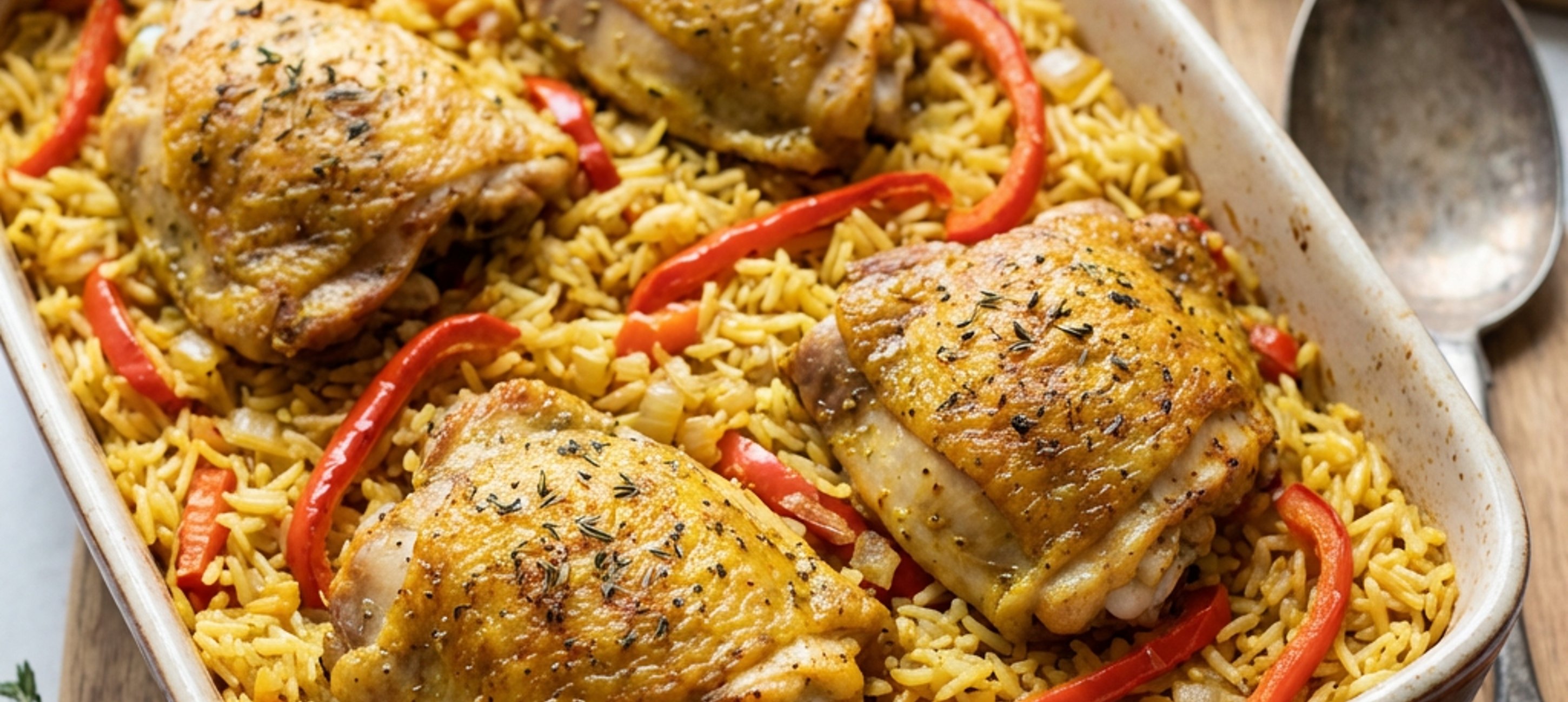 - 2Nyní začněte předehřívat troubu na 180 °C a nachystejte si pekáč (23 cm × 27 cm). Do pekáče nasypte rýži a přidejte k ní kari koření, sušený tymián, nakrájenou papriku, nakrájenou cibuli, prolisovaný česnek, 2 lžíce olivového oleje, sůl a pepř. Poté obsah pekáče zalijte kuřecím vývarem a promíchejte. Navrch vzniklé směsi položte nakrájená kuřecí stehna, která osolte a opepřete.