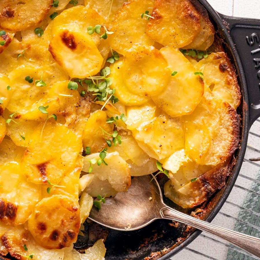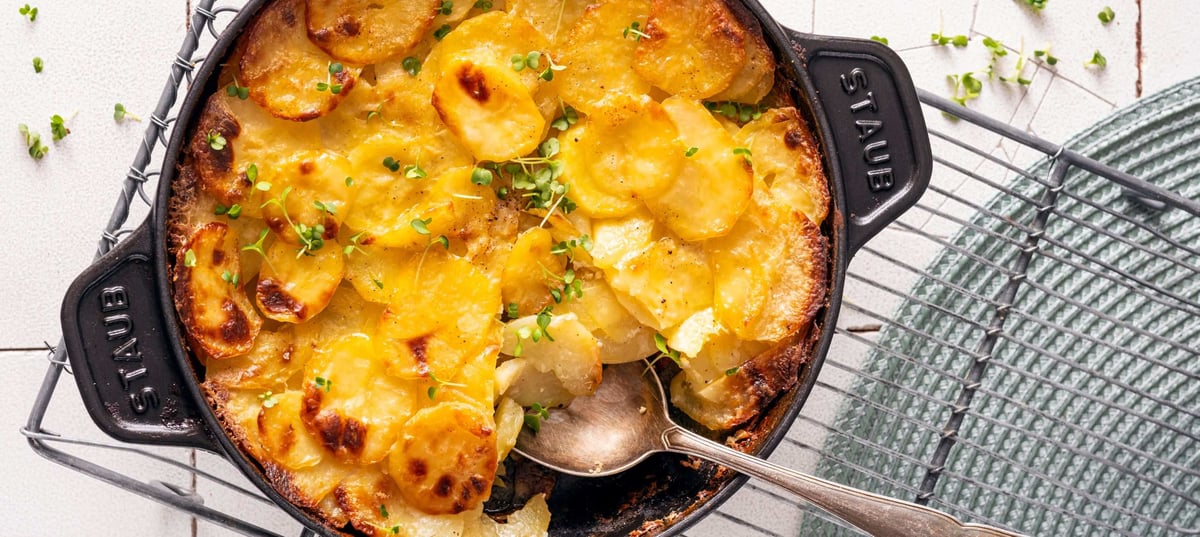 - 2Next, preheat the oven to 170 °C and take a small saucepan. Put the butter in the saucepan and melt it over low heat (it will take 2–3 minutes). Pour the melted butter into a larger bowl. Then peel the garlic, press it into the bowl with the butter, add nutmeg, salt, and pepper, and mix. Next, add the sliced potatoes to the bowl and mix again. Arrange the seasoned potatoes in the larger of the prepared pans, pour the cream over them, cover the surface of the mixture with baking paper, and place the smaller pan on top to weigh down the potatoes. You can add dried peas to the top pan to make it even heavier.