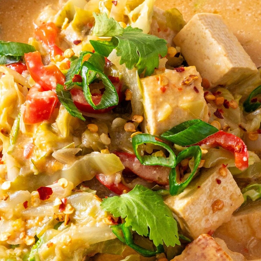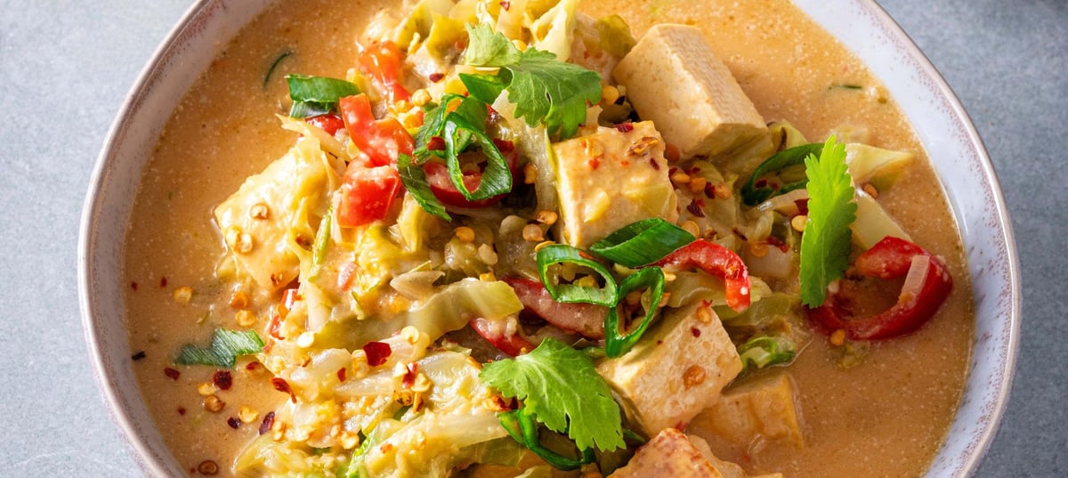 While the rice is simmering, prepare the curry itself. Take a pan and heat 3 tablespoons of oil in it over medium heat. Then add the diced tofu and onion to the pan and sauté for 3–4 minutes over medium heat. Next, add the sliced white cabbage and pepper, the prepared curry paste, salt, and pepper, and sauté everything for another 4–5 minutes over medium heat. Then add the coconut milk, vegetable broth, lime zest, and juice, mix everything, and bring the whole mixture to a boil over high heat. Then reduce the heat to medium and cook the contents of the pan for 14–15 minutes until the vegetables are tender.