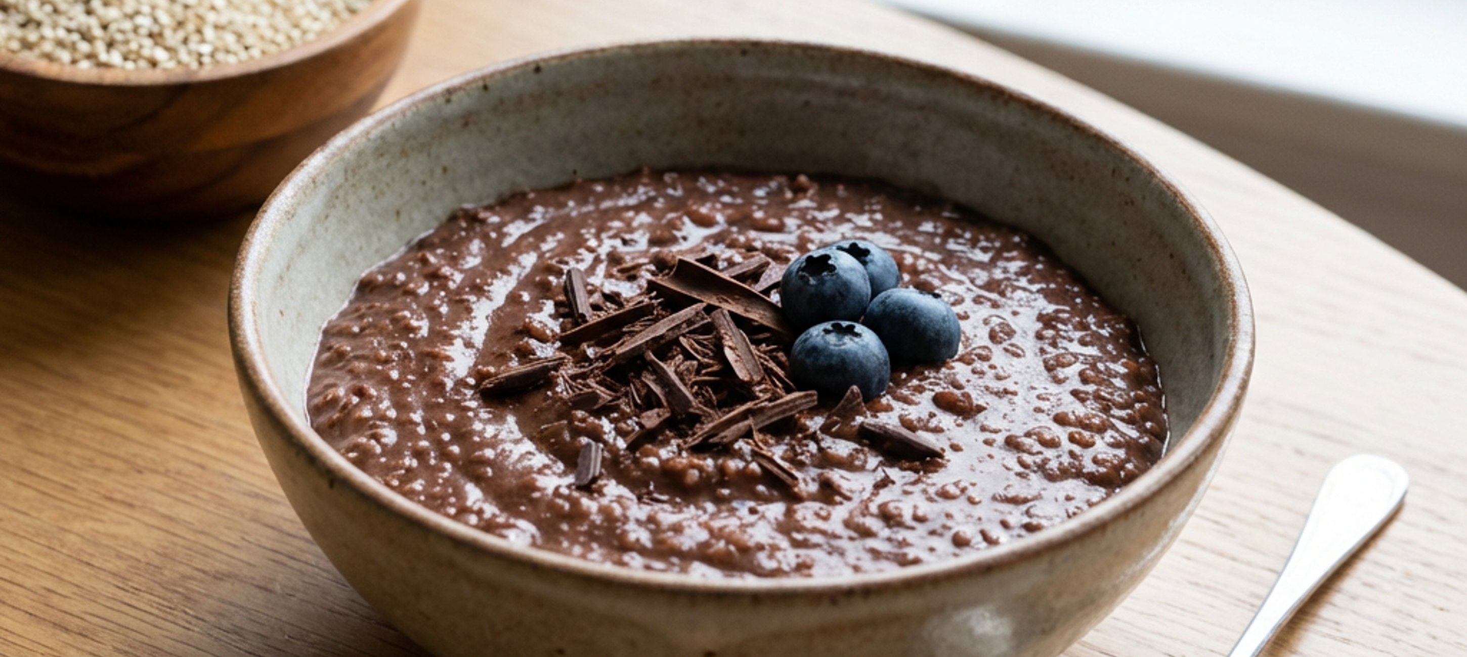 - 1Nachystejte si menší hrnec a vložte do něj quinou, skořici, holandské kakao, med a třtinový cukr. Poté celý obsah hrnce zalijte 400 ml vody a hrnec začněte zahřívat na silném plameni. Až voda začne vřít, ztlumte plamen na střední stupeň, hrnec přiklopte pokličkou a směs nechte vařit 13–15 minut, dokud quinoa nezměkne. V průběhu vaření směs v hrnci občas promíchejte a v mezičase si nahrubo nasekejte čokoládu.