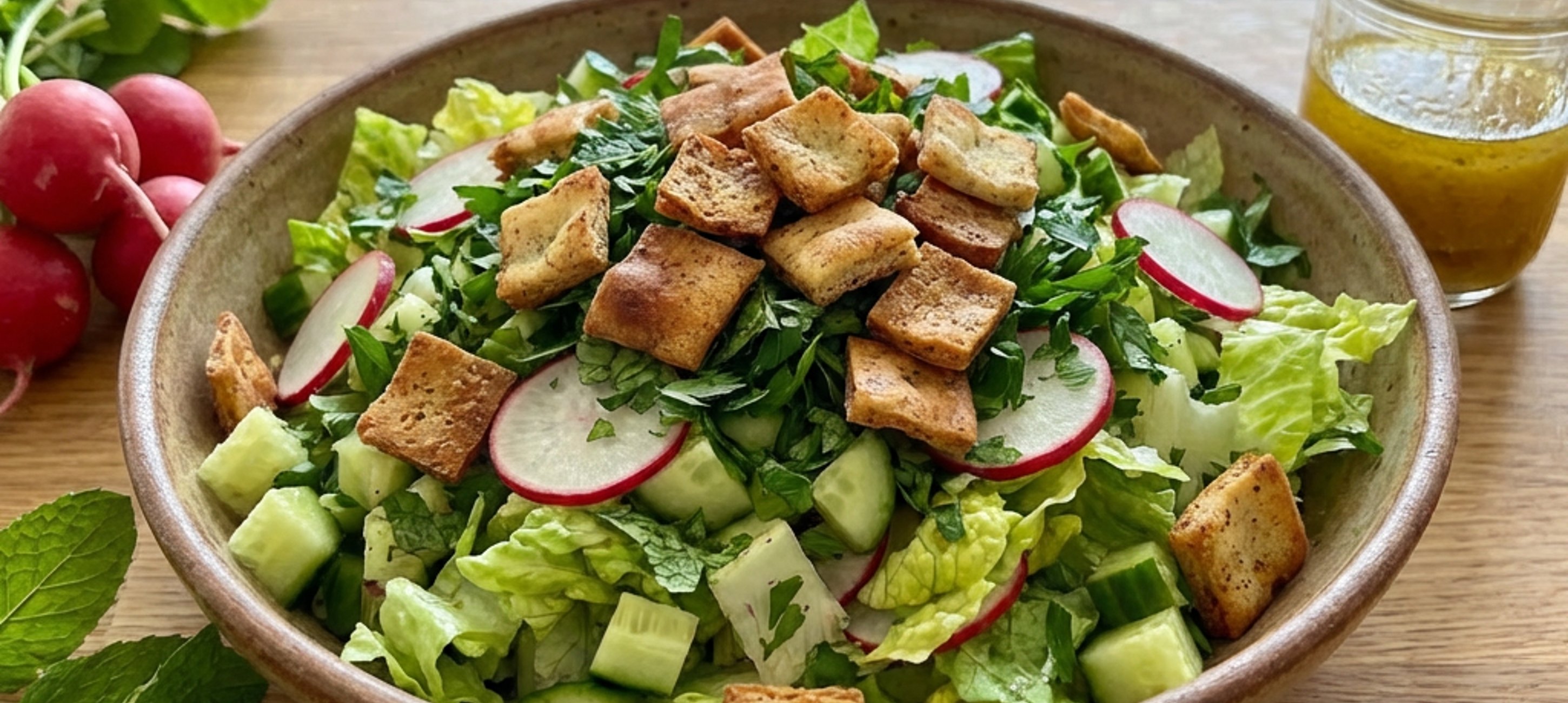 - 1Římský salát nakrájejte na menší kusy. Okurku a ředkvičky nakrájejte na menší kostičky. Jarní cibulku, petrželovou nať i mátu nakrájejte najemno. Nakrájené ingredience dejte do větší mísy.