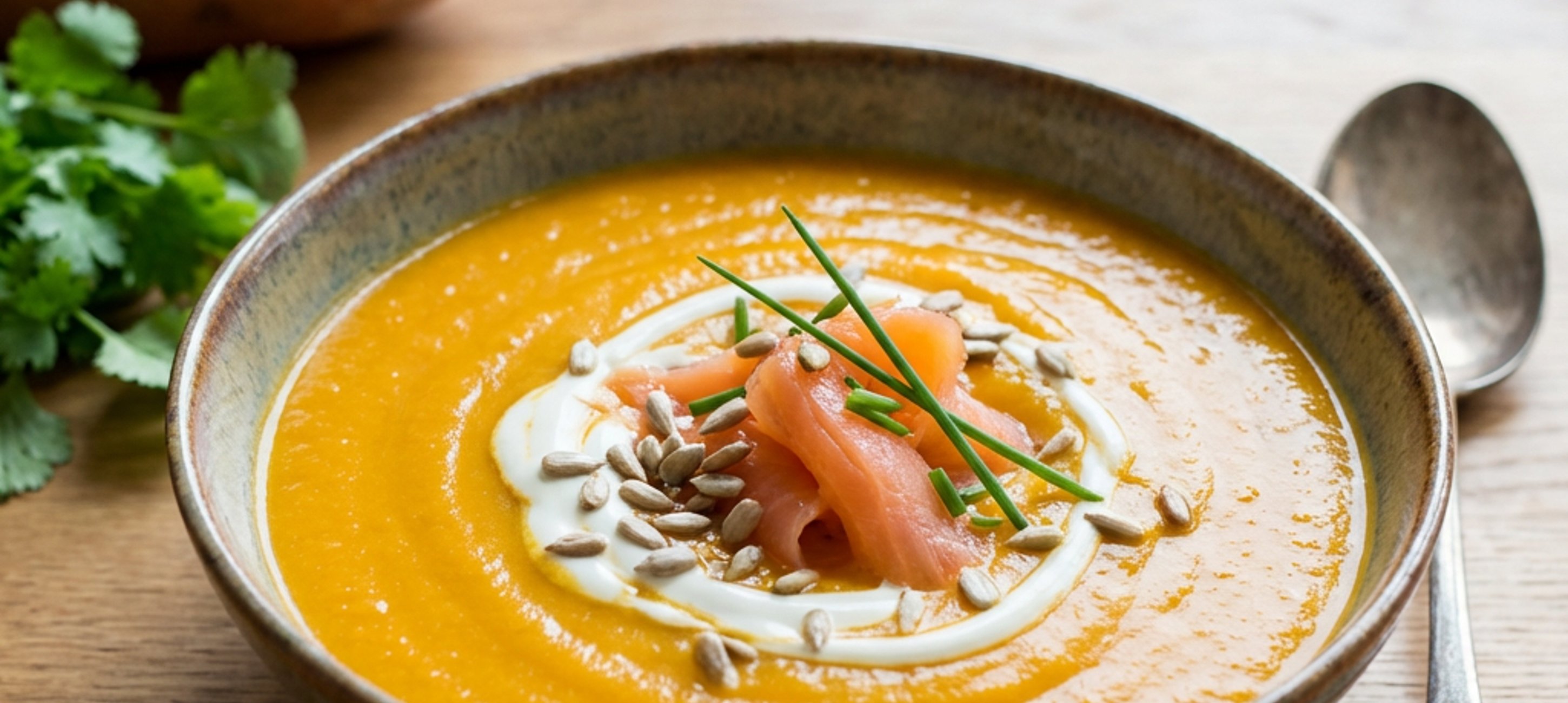 - 9Krém nalijeme do misek. Na každou porci přidáme lžíci zakysané smetany, kousek uzeného lososa, posypeme slunečnicovými semínky a případně čerstvým koriandrem nebo pažitkou.