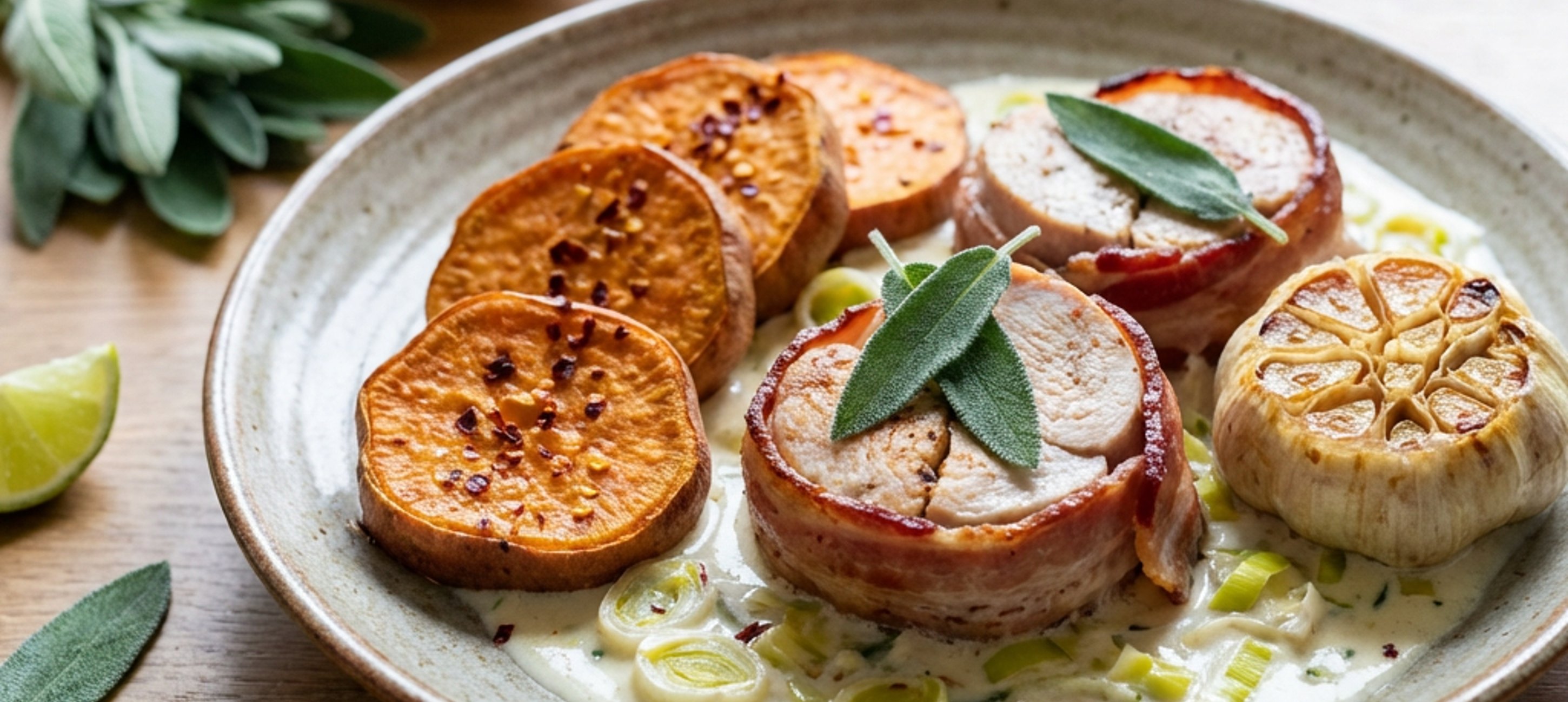 - 3V pekáčku smícháme créme fraiche s mlékem. Přidáme nasekaný pórek, sušenou šalvěj, osolíme a opepříme.