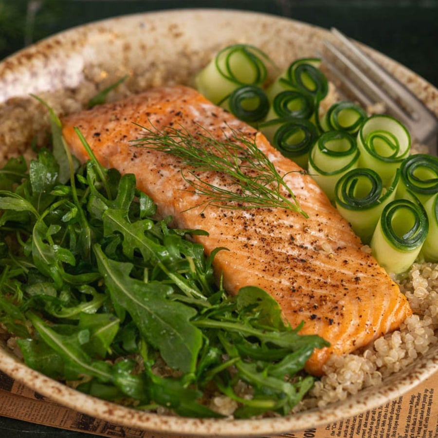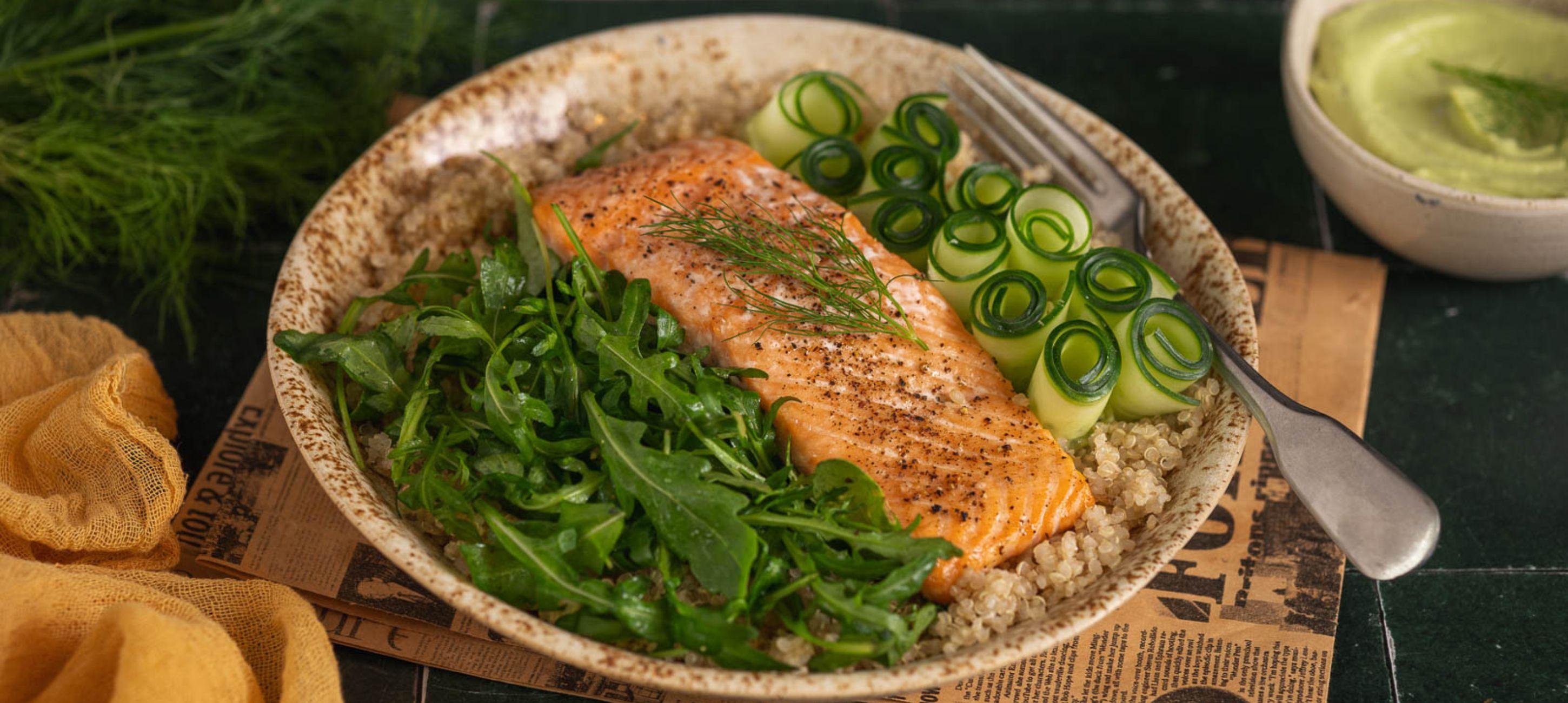 - 5Divide the cooked quinoa onto plates, place the arugula, salmon, and sliced cucumbers on top. Drizzle with the dip or serve it in a bowl.