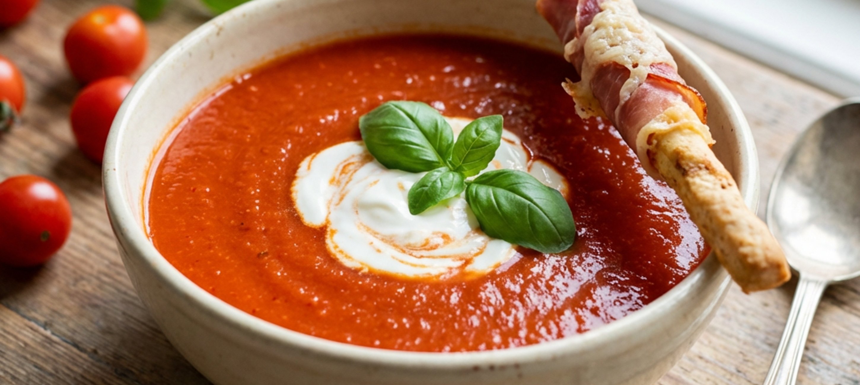 - 8Polévku servírujte teplou. Přidejte polévkovou lžíci zakysané smetany a čerstvou bylinku. Na hranu talíře položte opečenou grissini tyčinku.