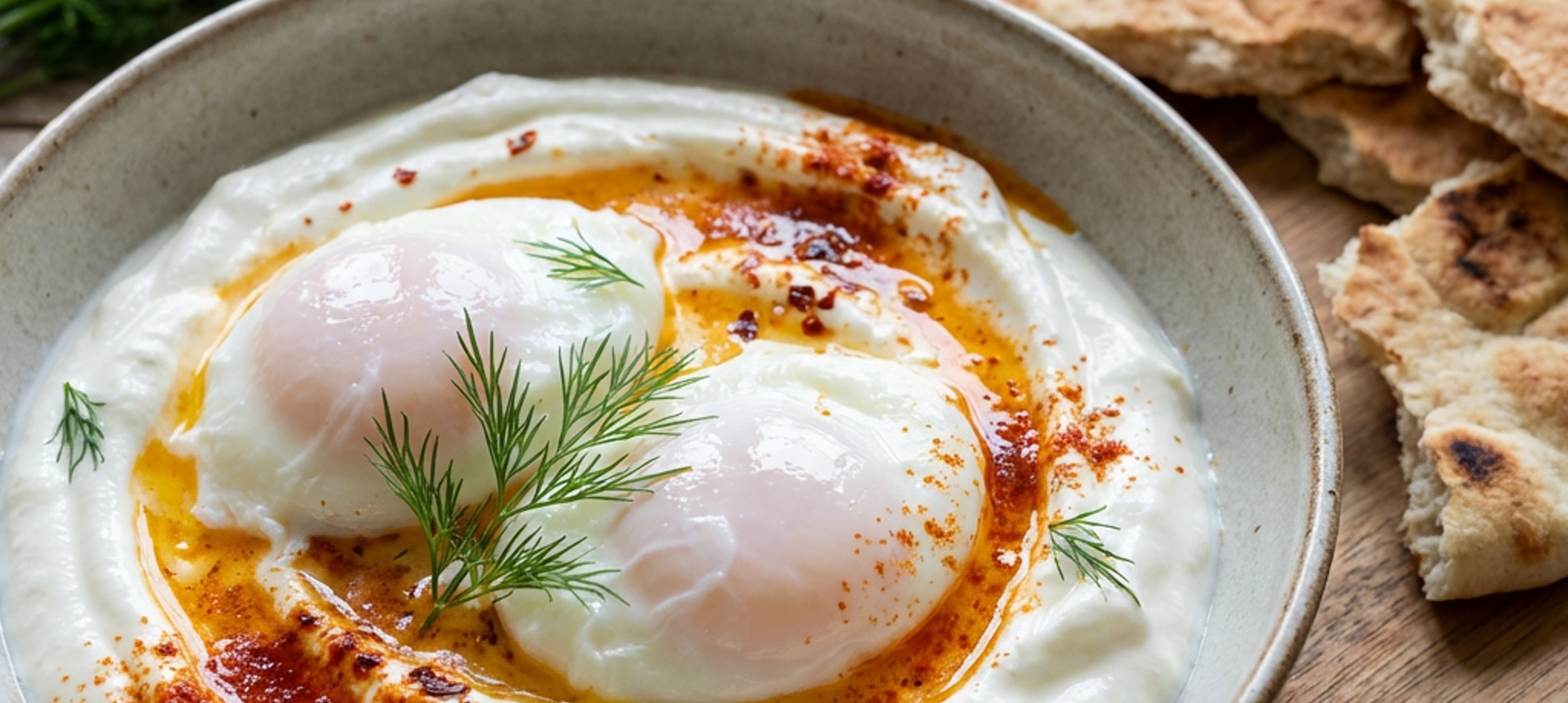 - 5Do misek rozdělíme ochucený jogurt. Na něj položíme vejce, polijeme máslem, ozdobíme snítkou kopru a podáváme.