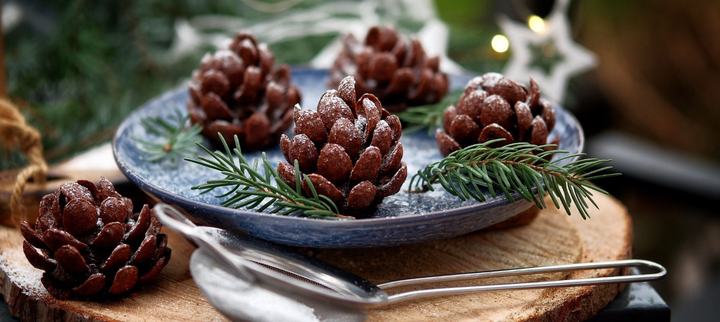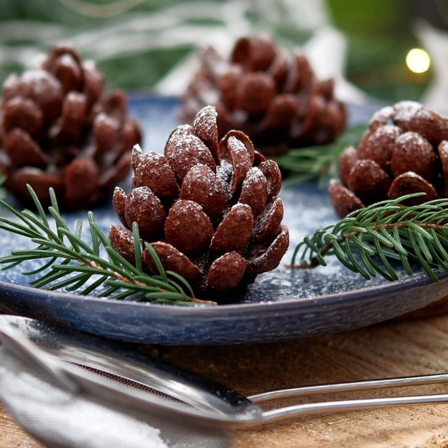 - 3Take small pieces of dough and shape them into cones that resemble the base of a pine cone. Then, insert chocolate cereal pieces into the surface of each cone, starting from the bottom and working upwards to create the structure of a pine cone.
