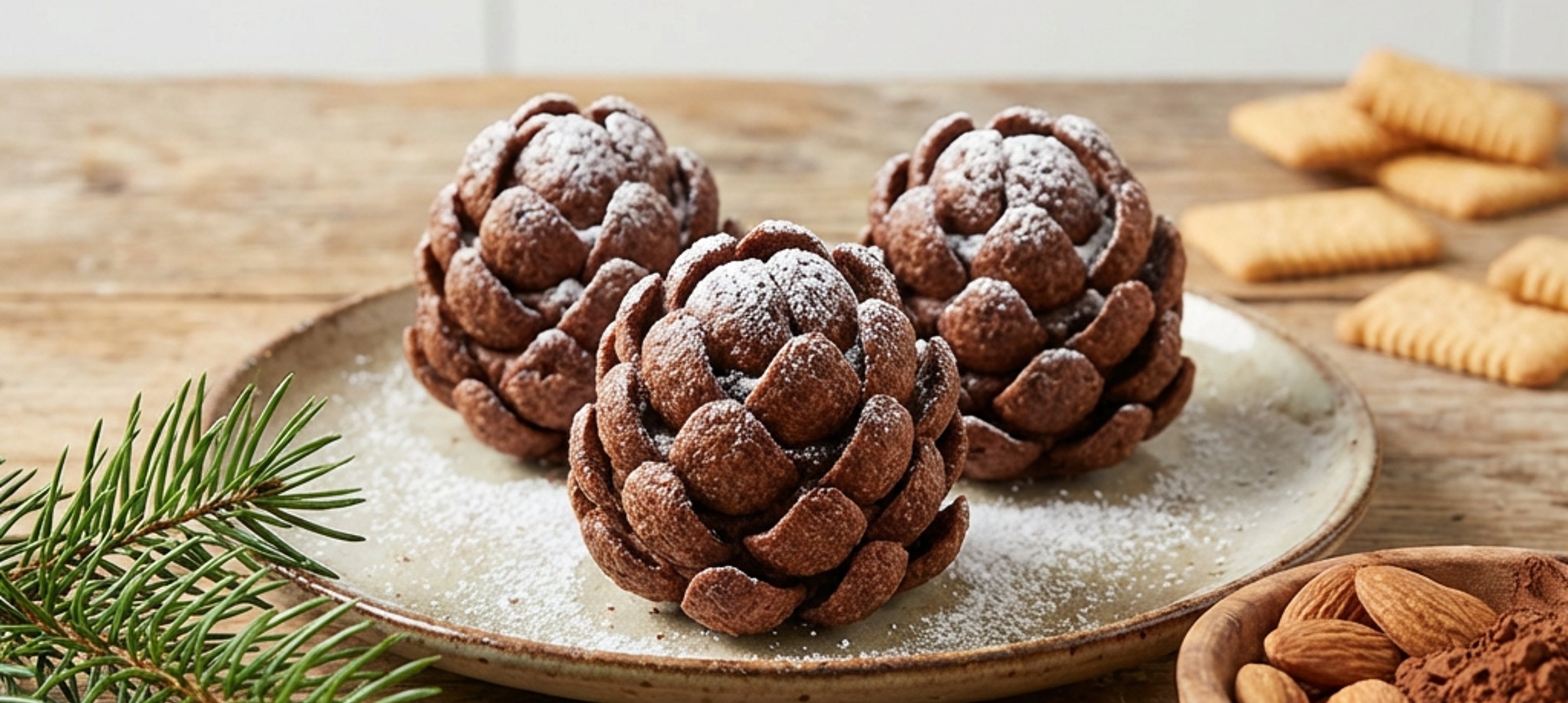 - 3Z těsta odebíráme malé kousky a tvarujeme z nich kužely, které připomínají základ šišky. Poté do povrchu každého kuželu zapichujeme čokoládové cereálie, začínáme odspodu a postupujeme směrem nahoru, abychom vytvořili strukturu šišky.