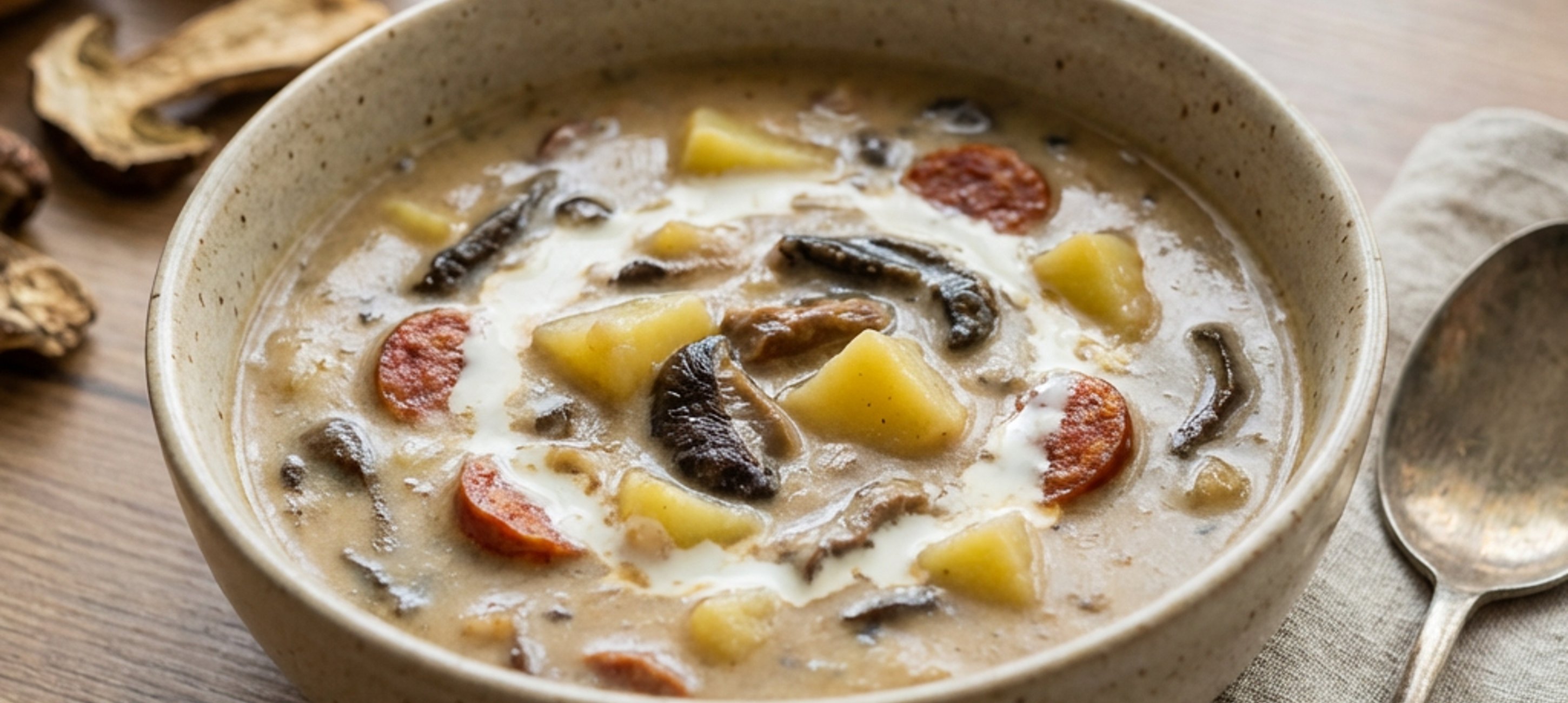 - 3Do hrnce přidejte na kusy nakrájenou klobásu, houby i s nálevem a přibližně 1 litr vody. Přidejte bobkové listy, najemno nakrájený česnek, osolte, opepřete a nechte vařit 20 - 30 minut.