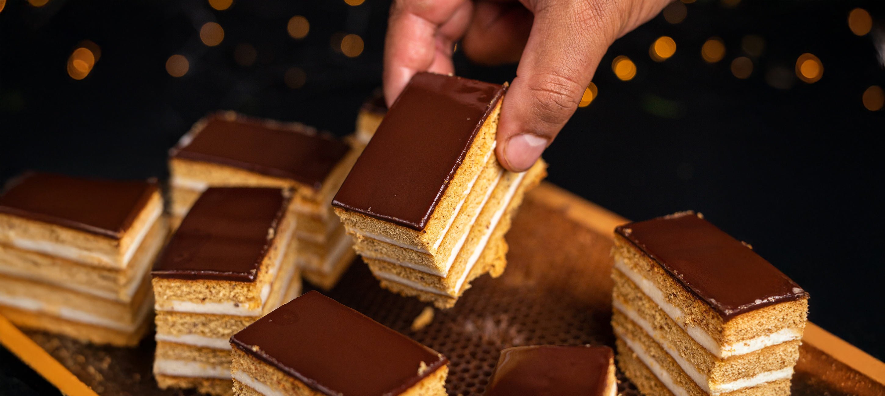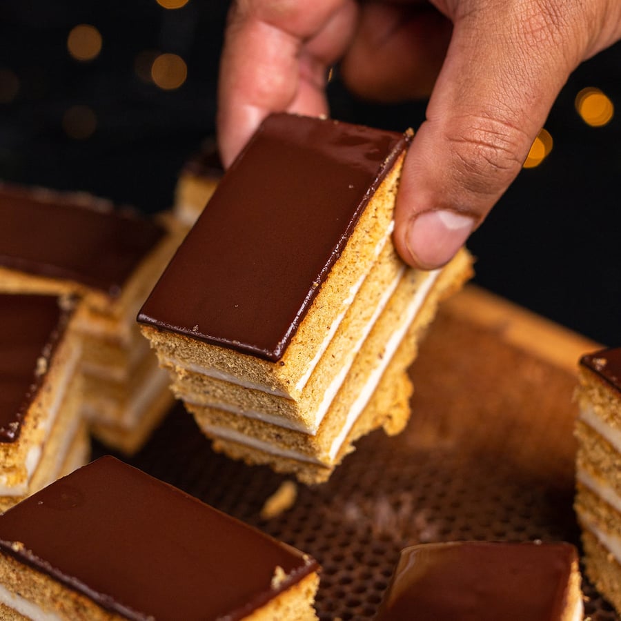 - 4Layer the baked dough sheets with an even layer of cream. Place baking paper on the top dough sheet, weigh down the slices, and let them rest in the fridge until the next day.
