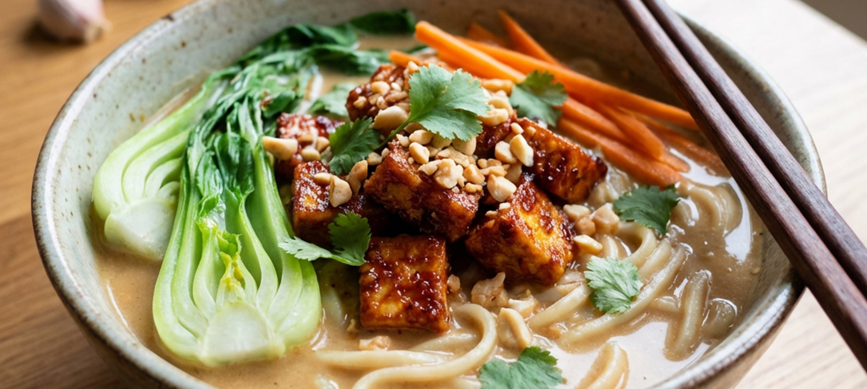 - 9Nudle uvaříme dle návodu na obalu. Poté vodu slijeme a ihned servírujeme: do misky vložíme nudle, zalijeme vývarem, vložíme opečenou mrkev, pak choi, tofu, čerstvý koriandr a posypeme sekanými arašídy.