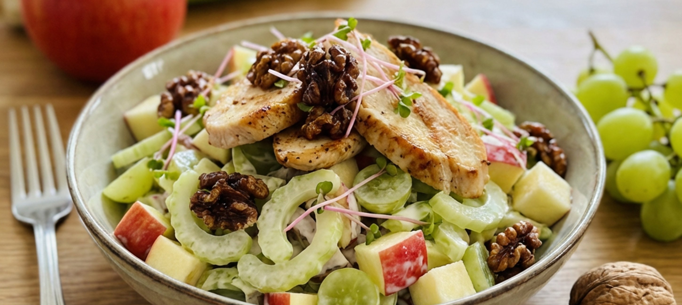 - 4Ve větší míse společně s dresinkem promícháme salát, jablka, celer, pekanové ořechy a hroznové víno.
