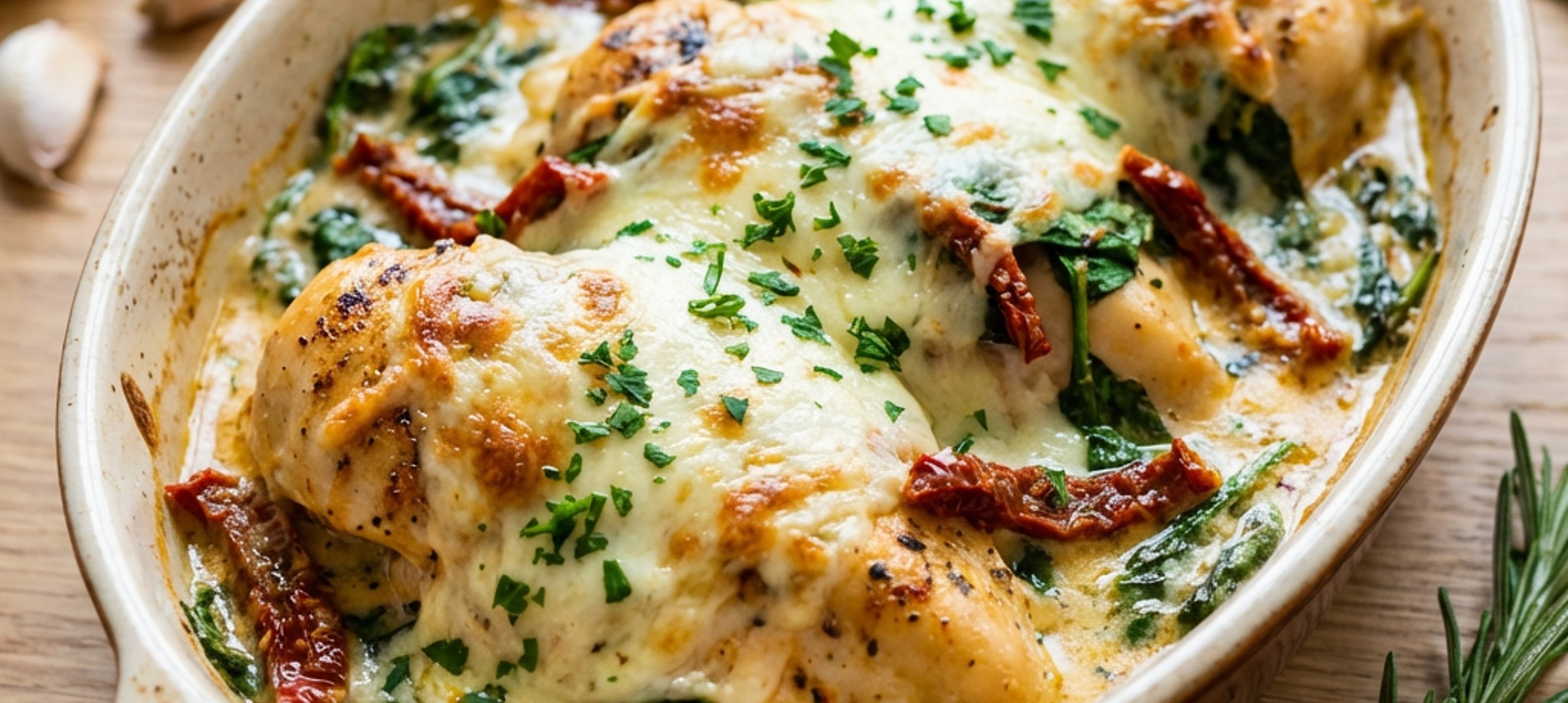 - 3Nyní oloupejte cibuli a společně s petrželovou natí ji nakrájejte najemno. Česnek oloupejte a prolisujte. Mozzarellu nastrouhejte nahrubo. Poté si vezměte menší pánev a na středním plameni v ní rozehřejte řepkový olej. Jakmile se olej rozehřeje, vložte do pánve nakrájenou cibuli a opékejte 3–4 minuty na středním plameni. Poté do pánve přidejte baby špenát a opékejte 2–4 minuty, dokud nezvadne. V průběhu opékání špenát promíchávejte, aby se z něj odpařilo co nejvíc vody. Následně pánev stáhněte z plamene a přidejte do ní smetanový sýr, nakrájenou petrželovou nať a prolisovaný česnek, promíchejte a dochuťte solí a pepřem. Vzniklou směsí zakryjte kuře se sušenými rajčaty, vršek posypte nastrouhanou mozzarellou a pečte 25–30 minut při 175–180 °C. Po upečení ihned podávejte.