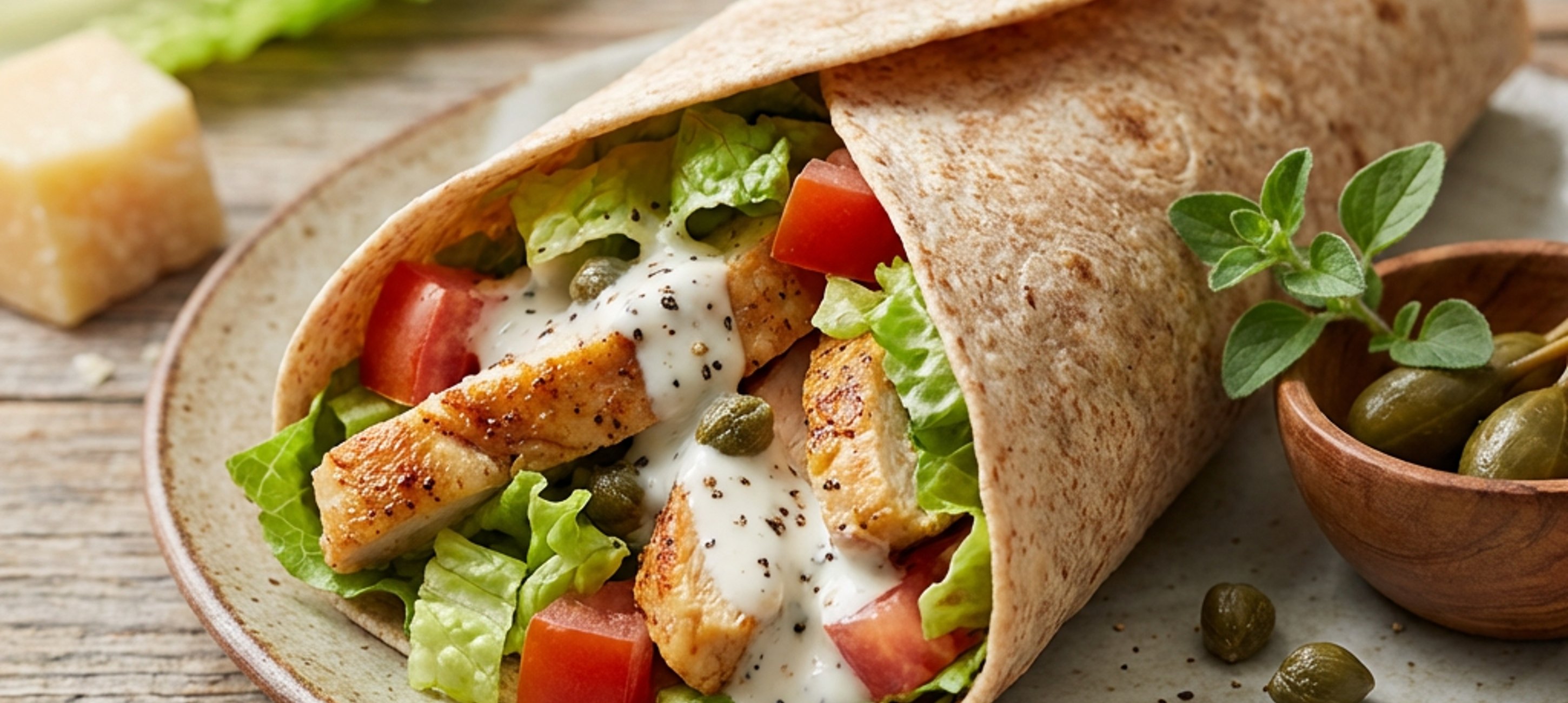 - 4Nyní si připravte tortilly a začněte tvořit wrapy: Doprostřed každé tortilly vždy vložte ¼ opečených kuřecích prsou, ¼ nakrájeného římského salátu a ¼ nakrájených rajčat a tuto náplň pokapejte připraveným jogurtovým dresinkem. Poté tortillu zabalte do wrapu: Nejprve přehněte volné boční okraje tortilly k jejímu středu, aby částečně překrývaly náplň, a přidržte je u sebe. Následně uchopte spodní okraj tortilly, přehněte ho přes náplň, důkladně zmáčkněte a přitom poposuňte o kousek zpět, aby pevně obepínal náplň. Poté přehněte zbývající volné boční okraje mírně ke středu tortilly a přes ně srolujte část s náplní směrem nahoru. Měl by tak vzniknout pevný, lehce hranatý balíček.