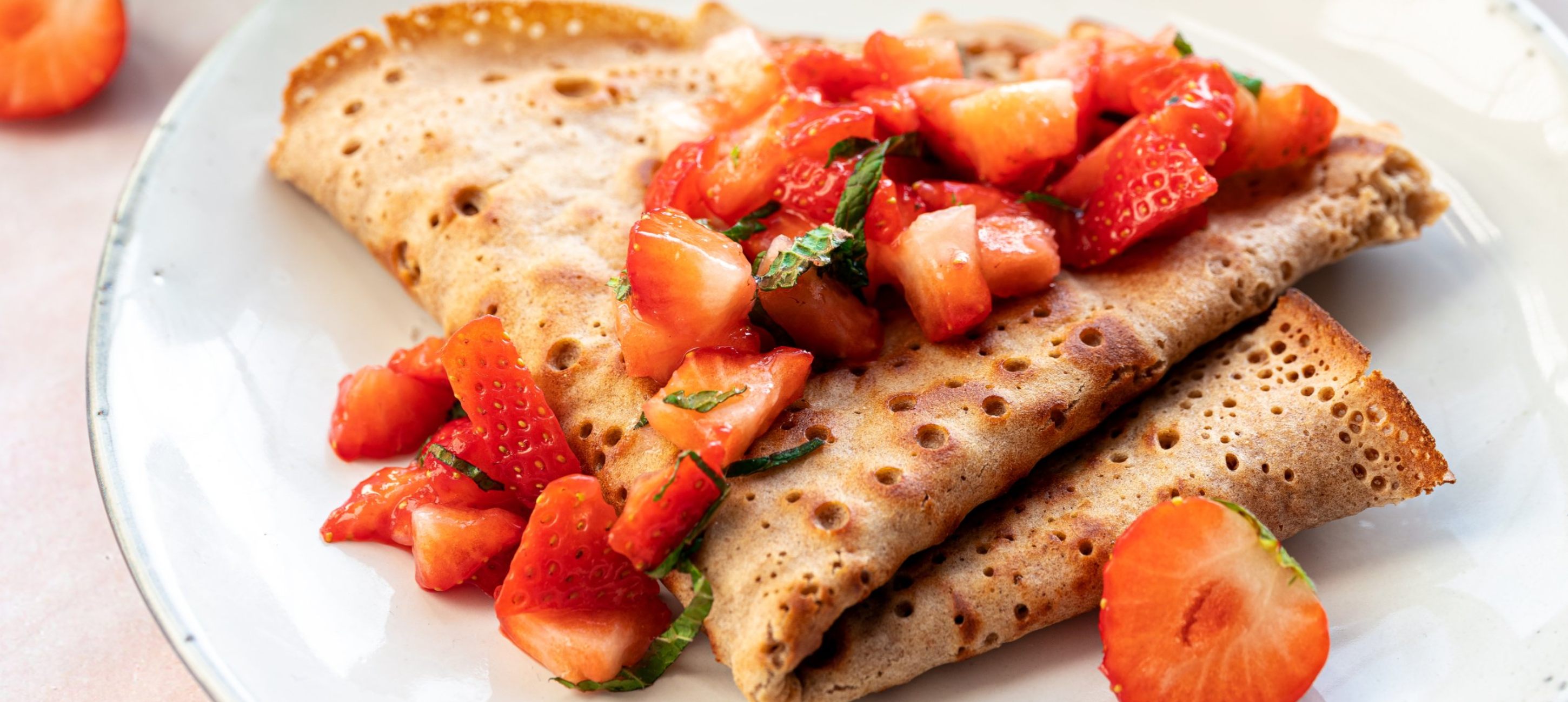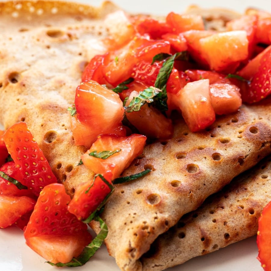 - 4Fill the cooked pancakes with the chilled strawberry mixture and serve.