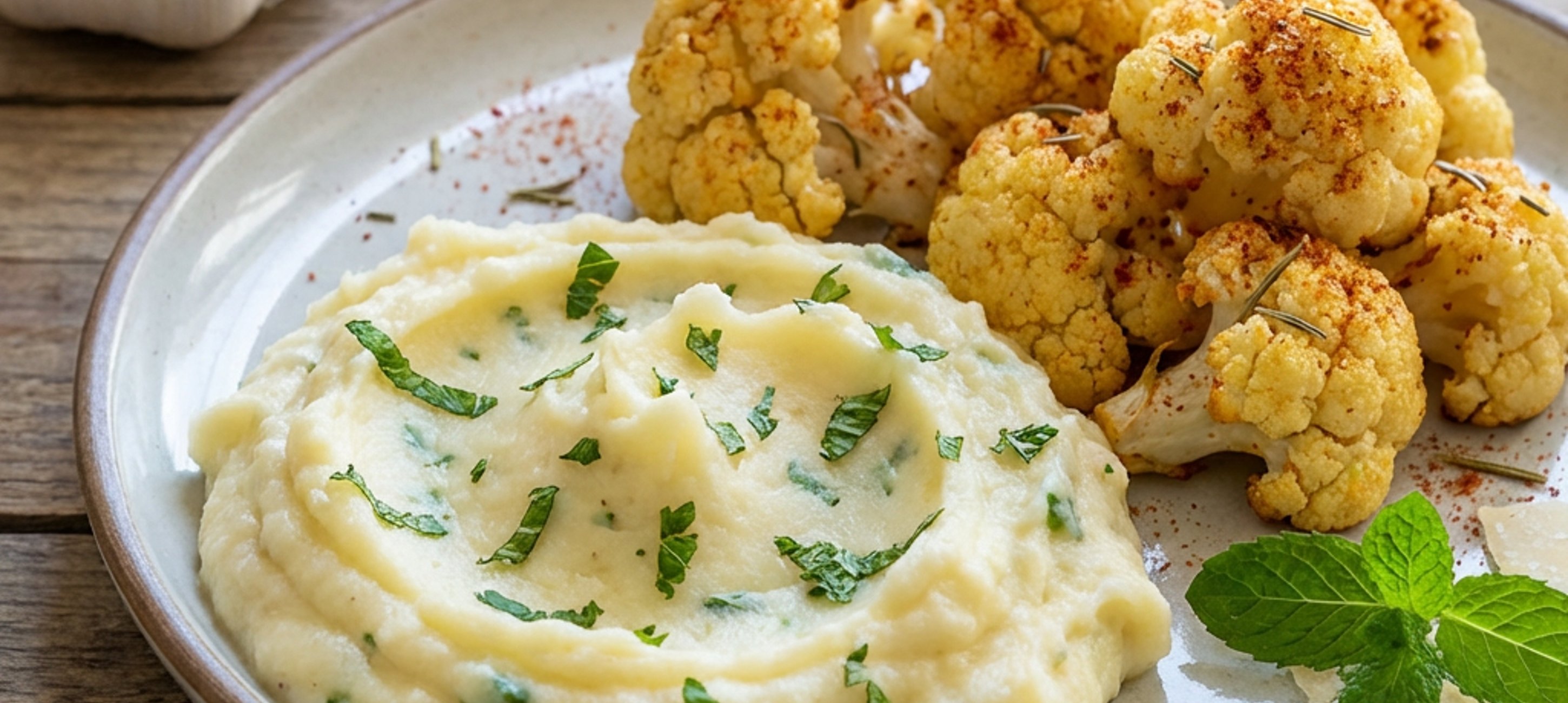 - 6Upečený květák rozdělte na 2 talíře, přidejte kaši a podávejte.