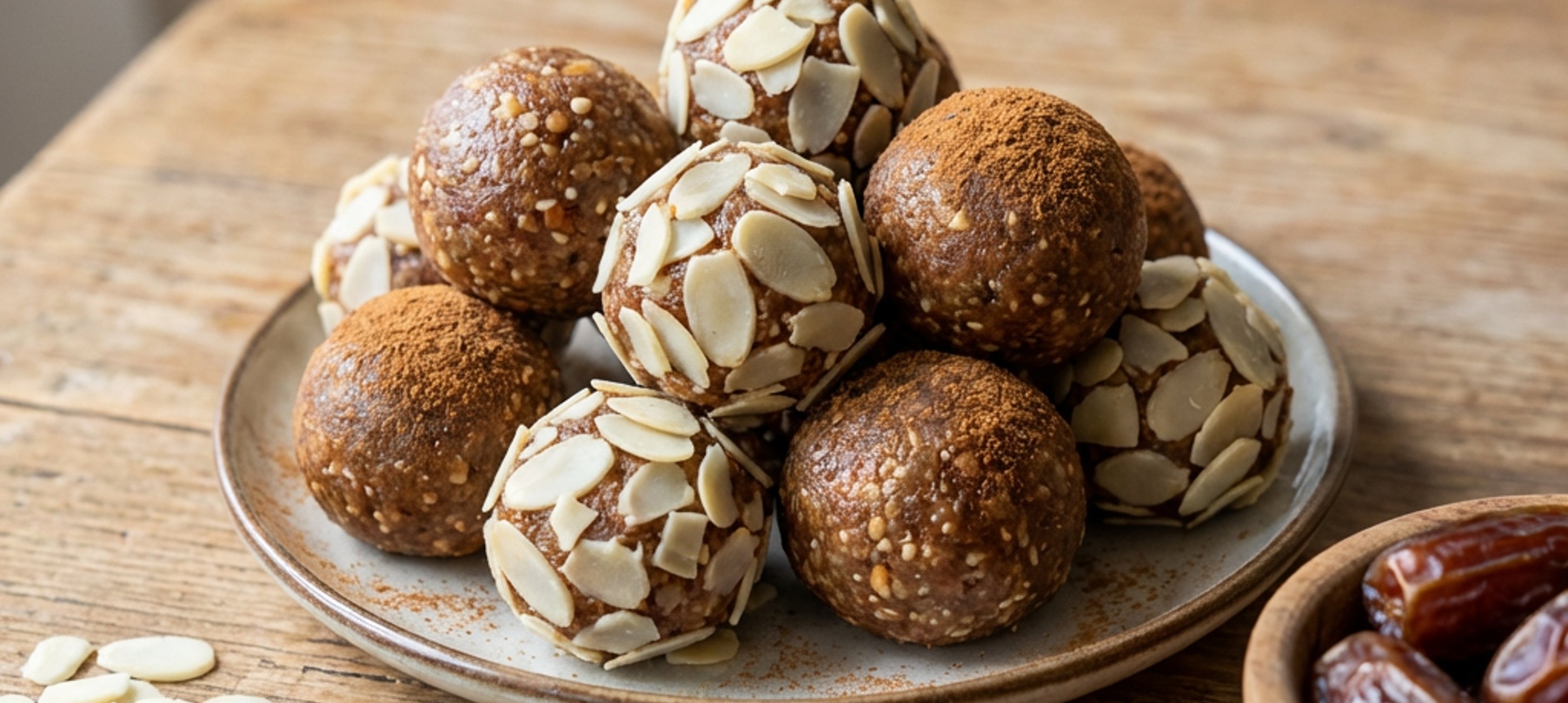 Pokud máte více času, rozmixujte veškeré ingredience bez plátkových mandlí. Ze vzniklého těsta udělejte kuličky a poté je v najemno nakrájených mandlovích plátcích obalte.