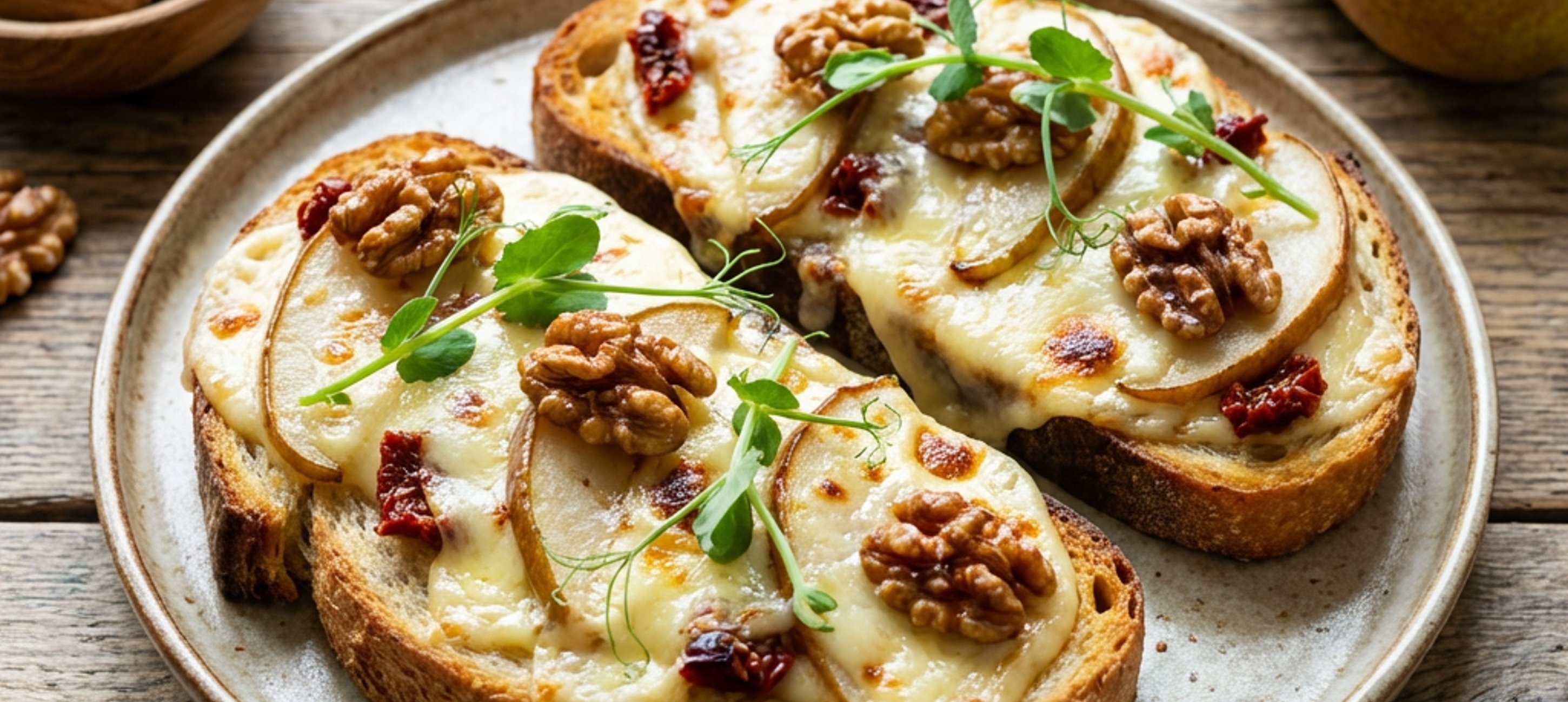 - 3Na každý upečený toust dáme microgreens, sušené rajče, grilovanou hrušku a karamelizovaný ořech. Dochutíme pepřem.